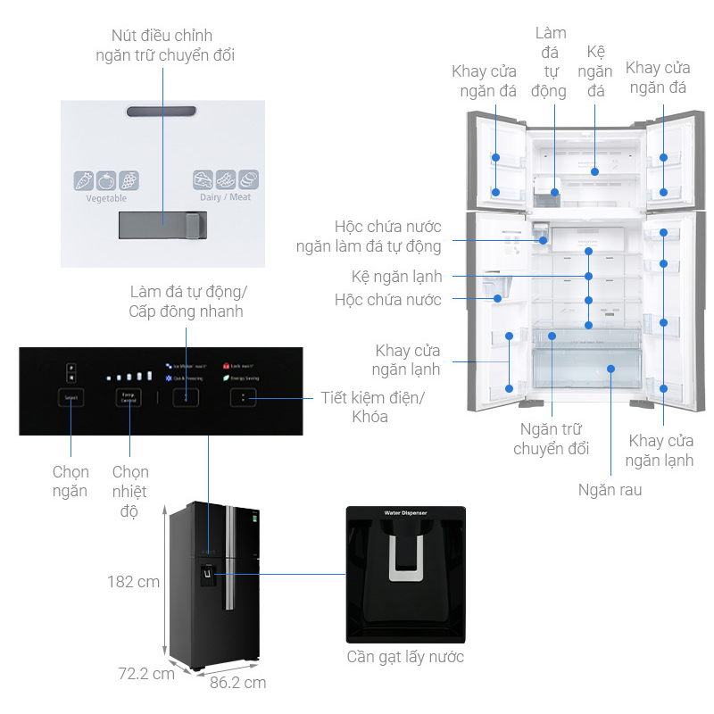 - Ngăn trữ thịt cá và rau quả tươi: Cho phép tùy chỉnh 2 mức nhiệt để trữ rau quả hoặc trữ sữa/thịt, giữ lạnh tốt, cho thực phẩm và thức ăn tươi ngon lâu hơn mà không bị đông đá.
