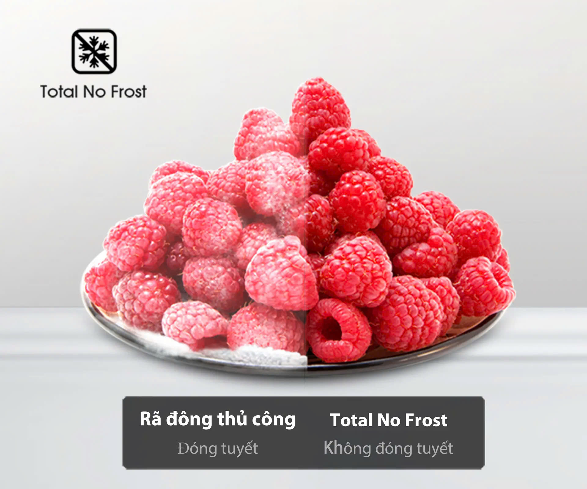 - Công nghệ Total No Frost loại bỏ việc tích tụ đá trong tủ lạnh, giúp bạn không cần phải rã đông thủ công. Điều này cũng giữ cho thực phẩm của bạn tươi ngon và toàn vẹn dưỡng chất trong thời gian dài hơn.