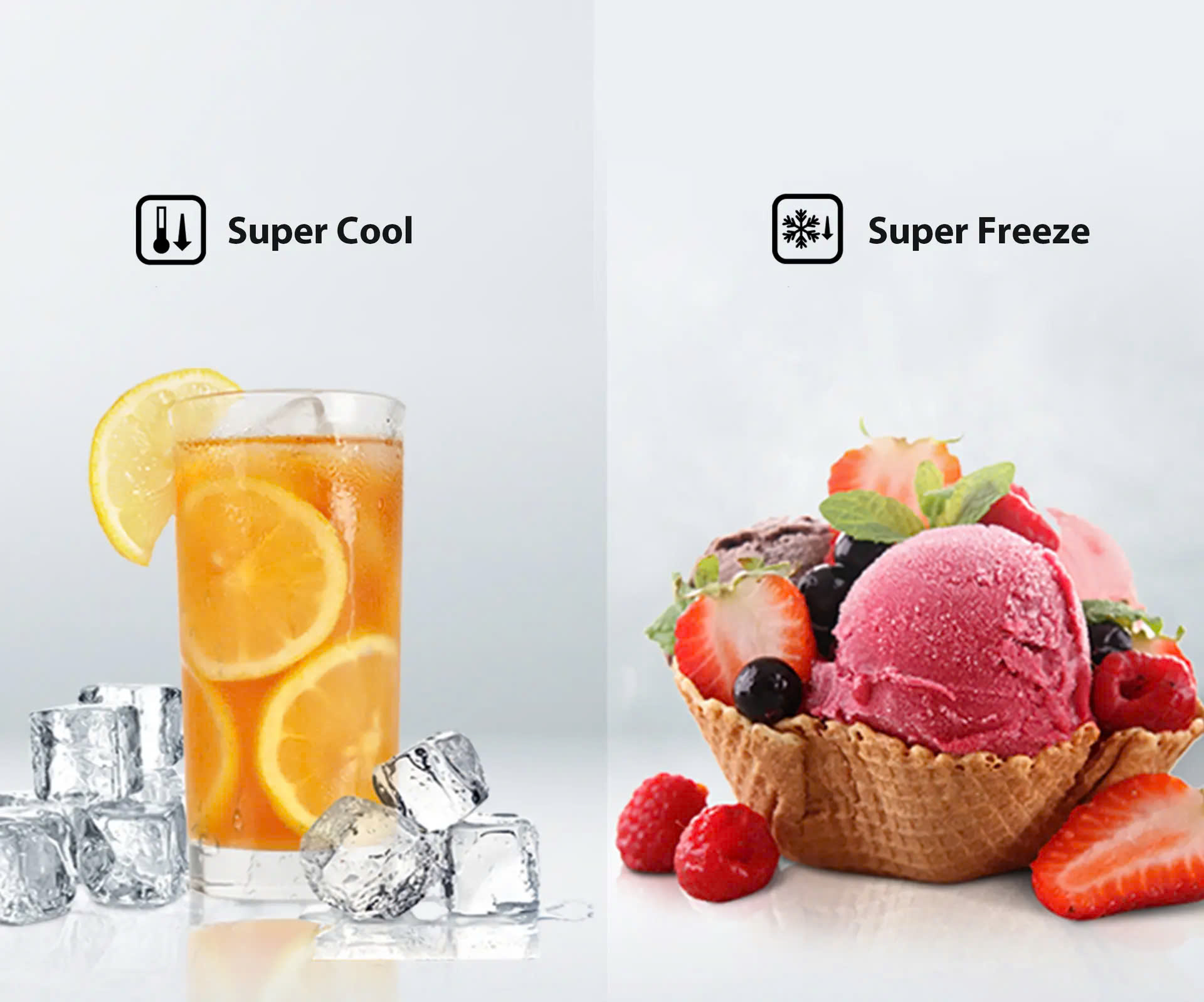 - Chức năng Super Freeze nhanh chóng hạ nhiệt độ ngăn đông và cấp đông thực phẩm nhanh hơn nhiều so với thông thường. Chức năng này giữ lại hương vị tự nhiên và kết cấu ban đầu của thực phẩm.