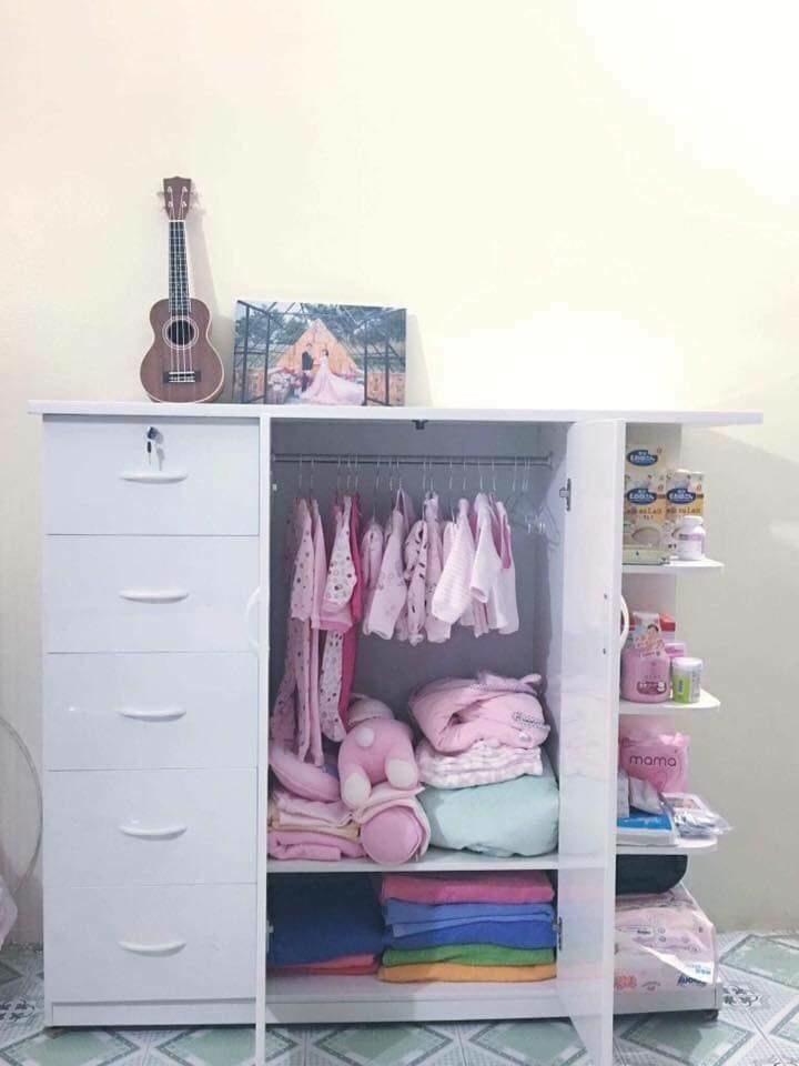 - Cấu tạo gồm 5 ngăn kéo, ngăn tủ 2 cánh có móc treo đồ và đợt để quần áo. Ngoài ra bên cạnh còn có kệ trang trí để những đồ hay sử dụng như bỉm, bình sữa, sữ hoặc đơn giản là để trang trí vô cùng tiện dụng và bắt mắt