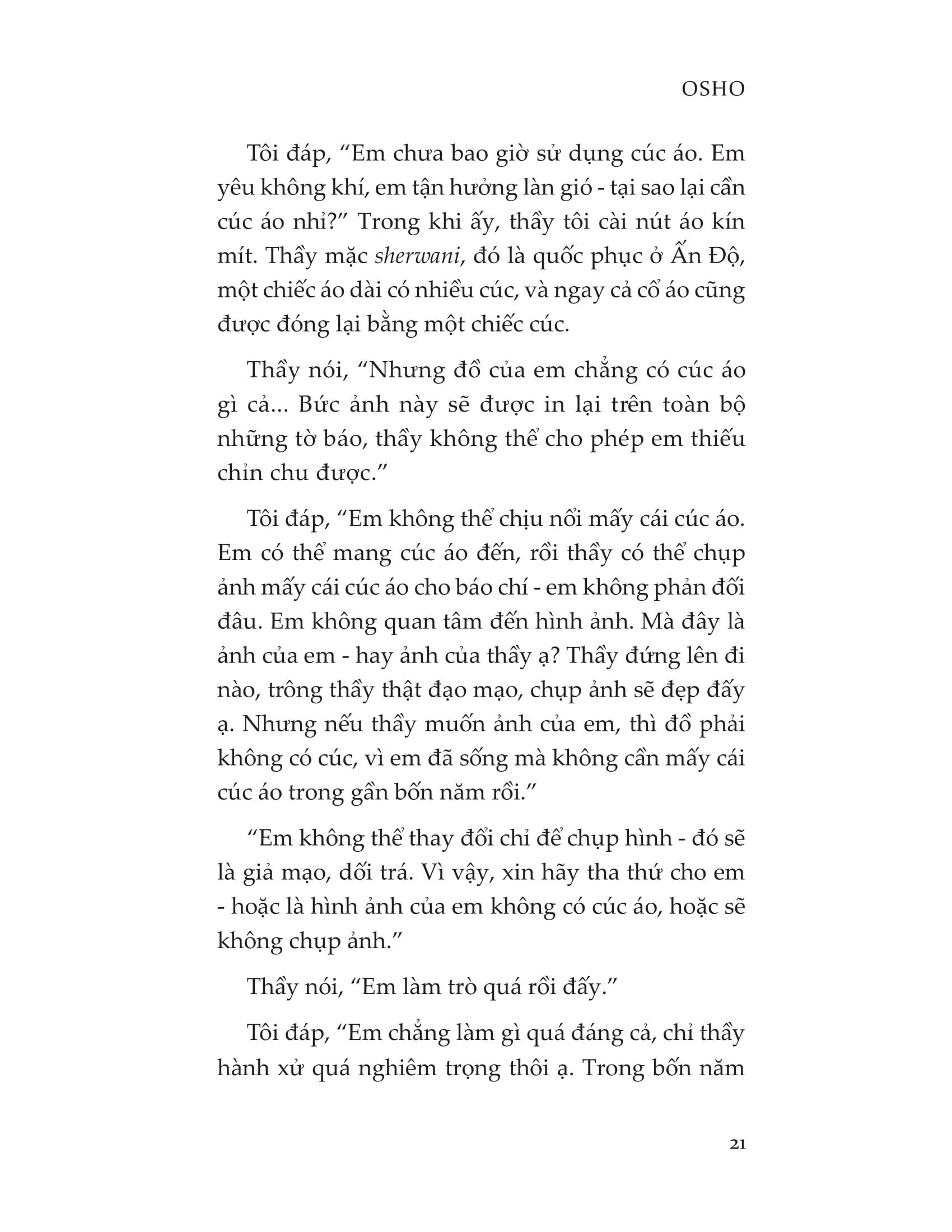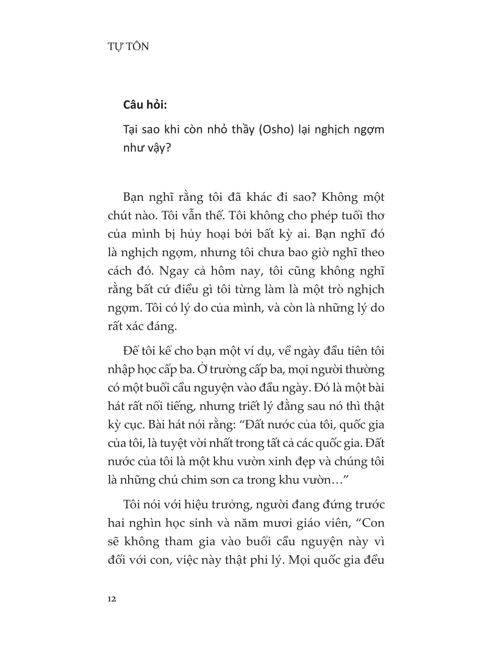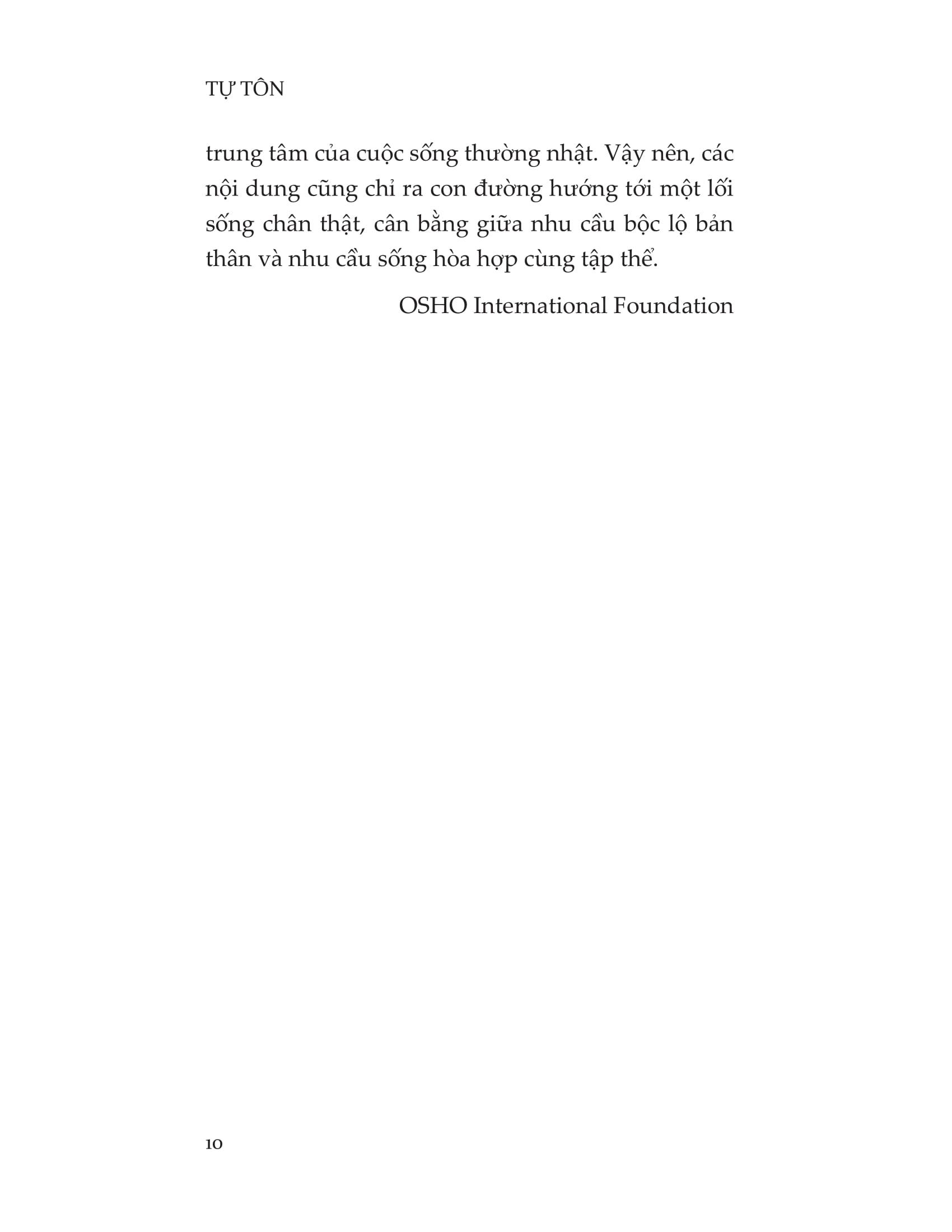 Tự Tôn Tự tôn là cuốn sách dẫn đường giúp những linh hồn đang lạc lối tìm lại được điều quan trọng nhất: bản thể chân thật của chính mình. Khi học được cách tôn trọng bản thân đúng nghĩa, chúng ta sẽ thoát khỏi mọi gông cùm về tư tưởng để tự do tung cánh, được bộc lộ trọn vẹn tính cách và năng lượng cá nhân, cũng như sống hòa hợp với tập thể, thanh thản trước mọi thăng trầm của cuộc đời. Mỗi chúng ta đều được sinh ra với một cái tôi độc nhất, thuần khiết và mạnh mẽ. Nhưng trong quá trình trưởng thành, chúng ta vô tình quên mất bản tính này và phải đeo lên những lớp mặt nạ do sức ép của xã hội, các quan điểm lạc hậu và những định kiến sai trái. Trong cuốn sách này, Osho giúp chúng ta định nghĩa lại con người mình. Đối với hầu hết mọi người, từ khi ta đủ lớn để biết đi, nhiều bài giảng tôn giáo và đạo đức đã được sử dụng để định hình hành vi của chúng ta - một con người nhỏ bé trong thế giới của rất nhiều con người khác. Osho nói rằng, nếu như chúng ta còn mang gánh nặng của những quan điểm và những điều mê tín dị đoan bị áp đặt lên bản thân này, thì ta thậm chí không thể bắt đầu một cuộc tìm kiếm trung thực để khám phá xem ta thực sự là ai. Một khi ta còn chưa biết mình là ai, sự tự tôn mà ta đang có hiện nay sẽ chỉ là một thứ được xây trên nền móng thiếu vững chắc, dễ dàng đổ sụp ngay vào khoảnh khắc một niềm tin nào đó mà chúng ta trân quý bị đặt dấu hỏi. Khi trả lời các câu hỏi của người lắng nghe thuyết giảng, Osho làm sáng tỏ sự thật rằng, những trải nghiệm của chúng ta trong cuộc sống hằng ngày bị tác động rất nhiều bởi các điều kiện tôn giáo và xã hội - và chúng ta thậm chí không nhận thức được thực tế này. Chúng ta liên tục bị kéo ra khỏi bản tính độc nhất mà mỗi chúng ta sở hữu khi mới sinh ra. Thay cho bản chất nguyên thể và độc nhất đó, một bản thể giả tạo đã được xây dựng. Cái tôi giả dối cuối cùng giành lấy quyền kiểm soát tâm trí chúng ta, tác động đến suy nghĩ của ta về sự thành công, về những mối quan hệ, cũng như về việc bản thân ta là ai. Trong Tự tôn, Osho giới thiệu đến độc giả ba yếu tố trụ cột: sự quan sát, sự nhận thức và sự tỉnh táo. Đây là chìa khóa để khám phá lại bản chất độc nhất của chúng ta, “cái tôi” chân thực nằm trong tất cả chúng ta. Và một khi ta tiến bước trên hành trình khám phá, thì mọi lẽ sai lầm mà chúng ta vẫn luôn mang theo người từ trước đến nay sẽ đơn giản là biến mất. Những bài thuyết giảng của Osho hướng tới cộng đồng những người hành thiền, những người sống và hợp tác nỗ lực nhằm đưa thiền định vào trung tâm của cuộc sống thường nhật. Các nội dung trong sách chỉ ra con đường hướng tới một lối sống chân thật, cân bằng giữa nhu cầu bộc lộ bản thân và nhu cầu sống hòa hợp cùng tập thể. Về tác giả Osho (1931-1990) là một đạo sư người Ấn được hàng triệu người trên thế giới tìm đọc. Hàng trăm cuốn sách cùng vô số bài thuyết giảng của ông về đề tài tâm linh đã để lại những dấu ấn khó phai trong lòng công chúng. Giáo lý của Osho đậm chất phương Đông, nhấn mạnh tới tầm quan trọng của thiền và sự tỉnh thức, từ đó hướng người tu tập buông bỏ cái tôi, nuôi dưỡng tình thương yêu và đánh thức nguồn năng lượng nguyên thủy từ trong căn cốt.