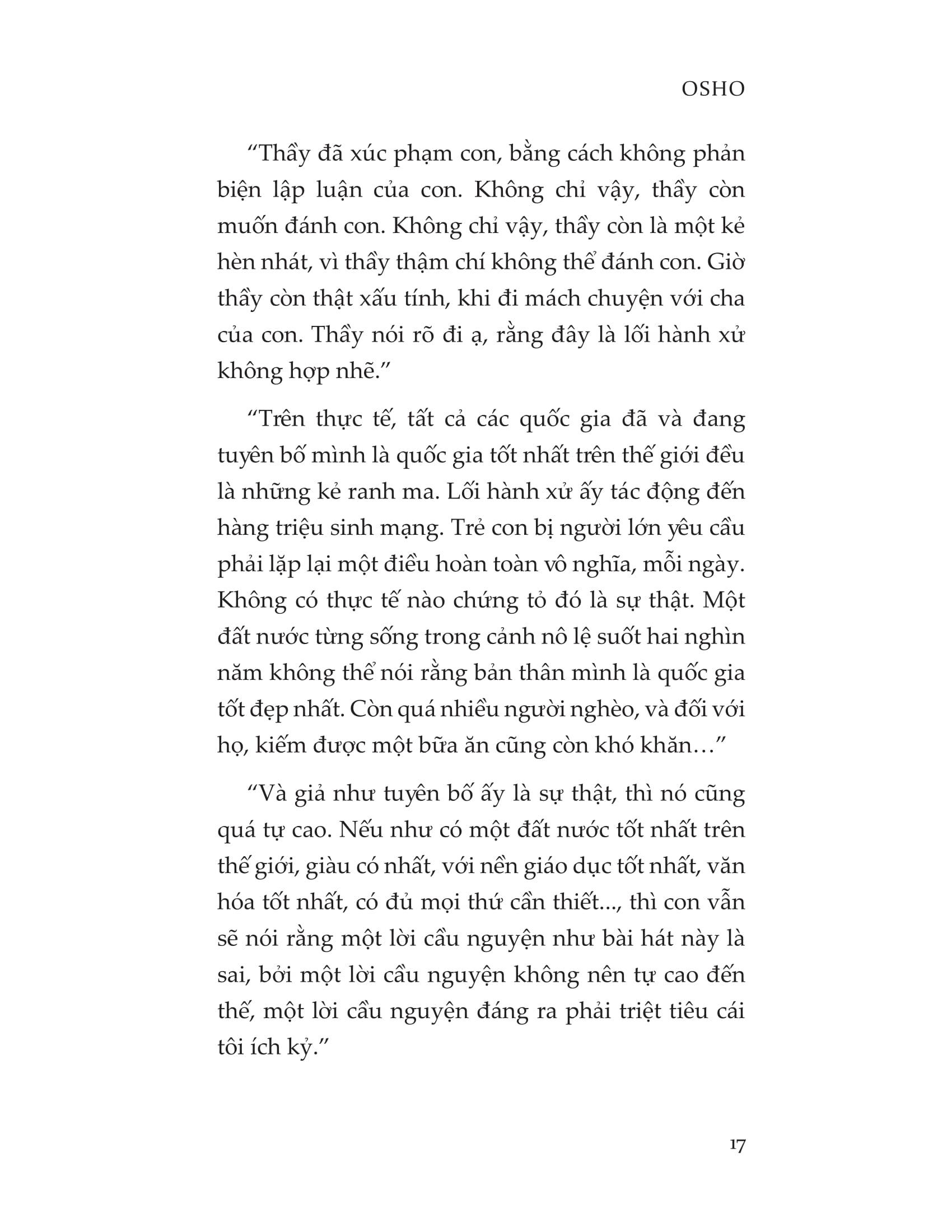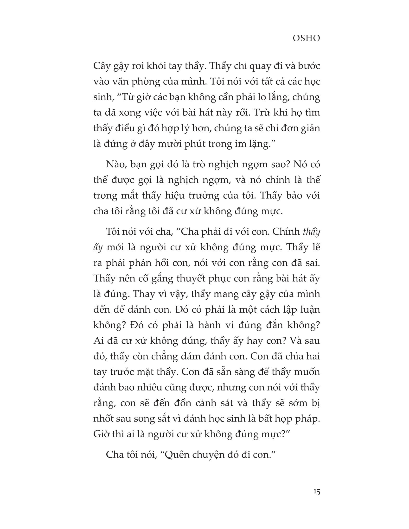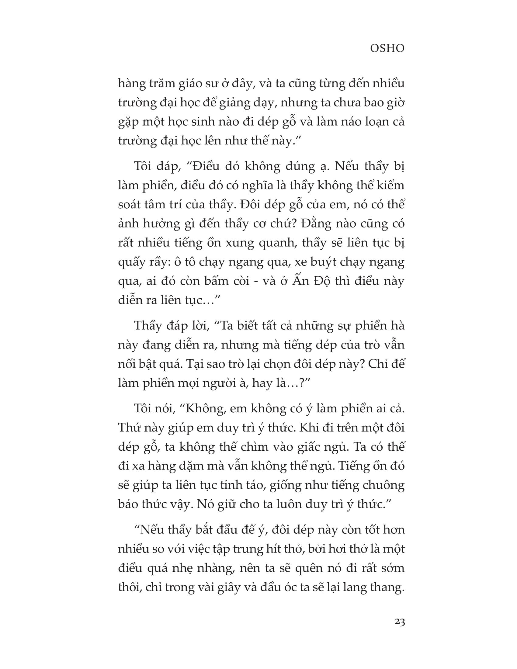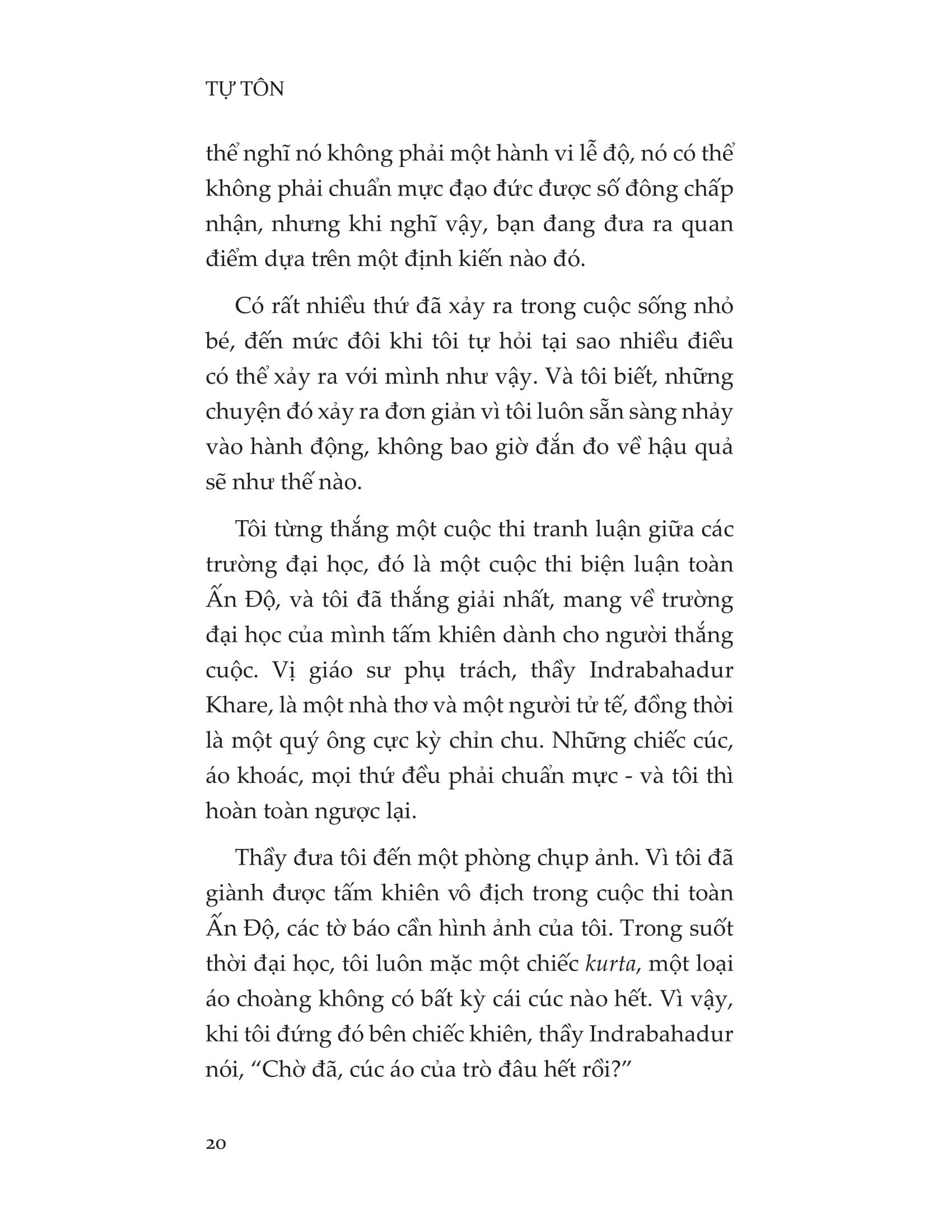 Tự Tôn Tự tôn là cuốn sách dẫn đường giúp những linh hồn đang lạc lối tìm lại được điều quan trọng nhất: bản thể chân thật của chính mình. Khi học được cách tôn trọng bản thân đúng nghĩa, chúng ta sẽ thoát khỏi mọi gông cùm về tư tưởng để tự do tung cánh, được bộc lộ trọn vẹn tính cách và năng lượng cá nhân, cũng như sống hòa hợp với tập thể, thanh thản trước mọi thăng trầm của cuộc đời. Mỗi chúng ta đều được sinh ra với một cái tôi độc nhất, thuần khiết và mạnh mẽ. Nhưng trong quá trình trưởng thành, chúng ta vô tình quên mất bản tính này và phải đeo lên những lớp mặt nạ do sức ép của xã hội, các quan điểm lạc hậu và những định kiến sai trái. Trong cuốn sách này, Osho giúp chúng ta định nghĩa lại con người mình. Đối với hầu hết mọi người, từ khi ta đủ lớn để biết đi, nhiều bài giảng tôn giáo và đạo đức đã được sử dụng để định hình hành vi của chúng ta - một con người nhỏ bé trong thế giới của rất nhiều con người khác. Osho nói rằng, nếu như chúng ta còn mang gánh nặng của những quan điểm và những điều mê tín dị đoan bị áp đặt lên bản thân này, thì ta thậm chí không thể bắt đầu một cuộc tìm kiếm trung thực để khám phá xem ta thực sự là ai. Một khi ta còn chưa biết mình là ai, sự tự tôn mà ta đang có hiện nay sẽ chỉ là một thứ được xây trên nền móng thiếu vững chắc, dễ dàng đổ sụp ngay vào khoảnh khắc một niềm tin nào đó mà chúng ta trân quý bị đặt dấu hỏi. Khi trả lời các câu hỏi của người lắng nghe thuyết giảng, Osho làm sáng tỏ sự thật rằng, những trải nghiệm của chúng ta trong cuộc sống hằng ngày bị tác động rất nhiều bởi các điều kiện tôn giáo và xã hội - và chúng ta thậm chí không nhận thức được thực tế này. Chúng ta liên tục bị kéo ra khỏi bản tính độc nhất mà mỗi chúng ta sở hữu khi mới sinh ra. Thay cho bản chất nguyên thể và độc nhất đó, một bản thể giả tạo đã được xây dựng. Cái tôi giả dối cuối cùng giành lấy quyền kiểm soát tâm trí chúng ta, tác động đến suy nghĩ của ta về sự thành công, về những mối quan hệ, cũng như về việc bản thân ta là ai. Trong Tự tôn, Osho giới thiệu đến độc giả ba yếu tố trụ cột: sự quan sát, sự nhận thức và sự tỉnh táo. Đây là chìa khóa để khám phá lại bản chất độc nhất của chúng ta, “cái tôi” chân thực nằm trong tất cả chúng ta. Và một khi ta tiến bước trên hành trình khám phá, thì mọi lẽ sai lầm mà chúng ta vẫn luôn mang theo người từ trước đến nay sẽ đơn giản là biến mất. Những bài thuyết giảng của Osho hướng tới cộng đồng những người hành thiền, những người sống và hợp tác nỗ lực nhằm đưa thiền định vào trung tâm của cuộc sống thường nhật. Các nội dung trong sách chỉ ra con đường hướng tới một lối sống chân thật, cân bằng giữa nhu cầu bộc lộ bản thân và nhu cầu sống hòa hợp cùng tập thể. Về tác giả Osho (1931-1990) là một đạo sư người Ấn được hàng triệu người trên thế giới tìm đọc. Hàng trăm cuốn sách cùng vô số bài thuyết giảng của ông về đề tài tâm linh đã để lại những dấu ấn khó phai trong lòng công chúng. Giáo lý của Osho đậm chất phương Đông, nhấn mạnh tới tầm quan trọng của thiền và sự tỉnh thức, từ đó hướng người tu tập buông bỏ cái tôi, nuôi dưỡng tình thương yêu và đánh thức nguồn năng lượng nguyên thủy từ trong căn cốt.