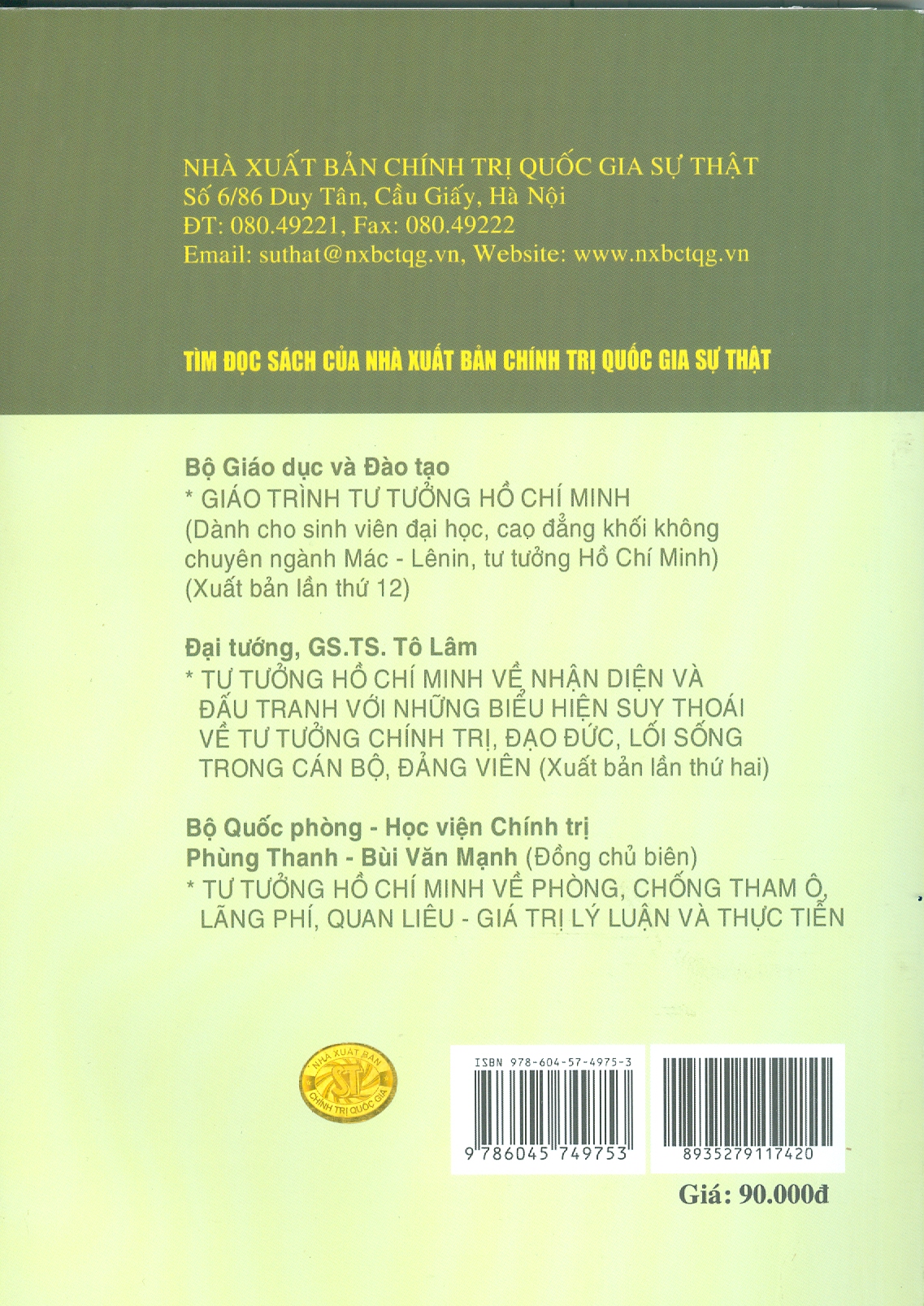 Nhà xuất bản Chính trị quốc gia Sự thật Tác giả: GS.TS. Mạch Quang Thắng (Chủ biên) Năm xuất bản: 6/2021 Số trang: 272 Giáo trình Tư tưởng Hồ Chí Minh - Dành cho bậc