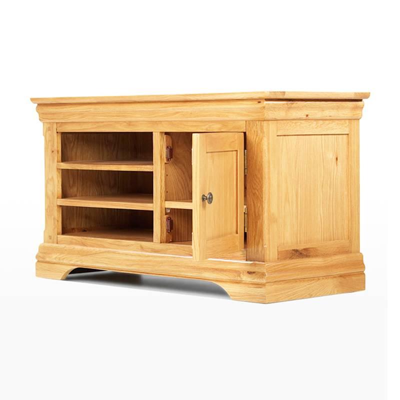Là sự kết hợp hoàn hảo giữa sức quyến rũ vượt thời gian với tính thực dụng hiện đại, mẫu tủ TV gợi nhớ đến phong cách cổ điển Pháp thế kỷ 19. Thuộc bộ sưu tập Victoria đặc trưng bởi mái vòm và những đường cong quyến rũ, thêm kiểu thiết kế 1 cánh lệch duyên dáng. Chính vì thế, nếu không có chương trình gì hay trên TV thì chiếc tủ này cũng giúp bạn có thứ để ngắm nghía, chiêm ngưỡng. Một hộc lớn với kệ di động để cất giữ đồ dùng không muốn trưng bày, còn bề mặt và các ngăn chính giữa sẽ giúp bạn để các thiết bị âm thanh giải trí hay những đồ trang trí khác. Chất liệu gỗ sồi trắng Mỹ nhập khẩu, có giá trị kinh tế cao và được chế tác hoàn toàn thủ công bởi những người thợ lành nghề. Toàn bộ bề mặt được sơn phủ PU kỹ càng, giữ nguyên được vẻ đẹp của vân gỗ, đồng thời bảo vệ lớp gỗ lâu bền trong các điều kiện khí hậu khác nhau