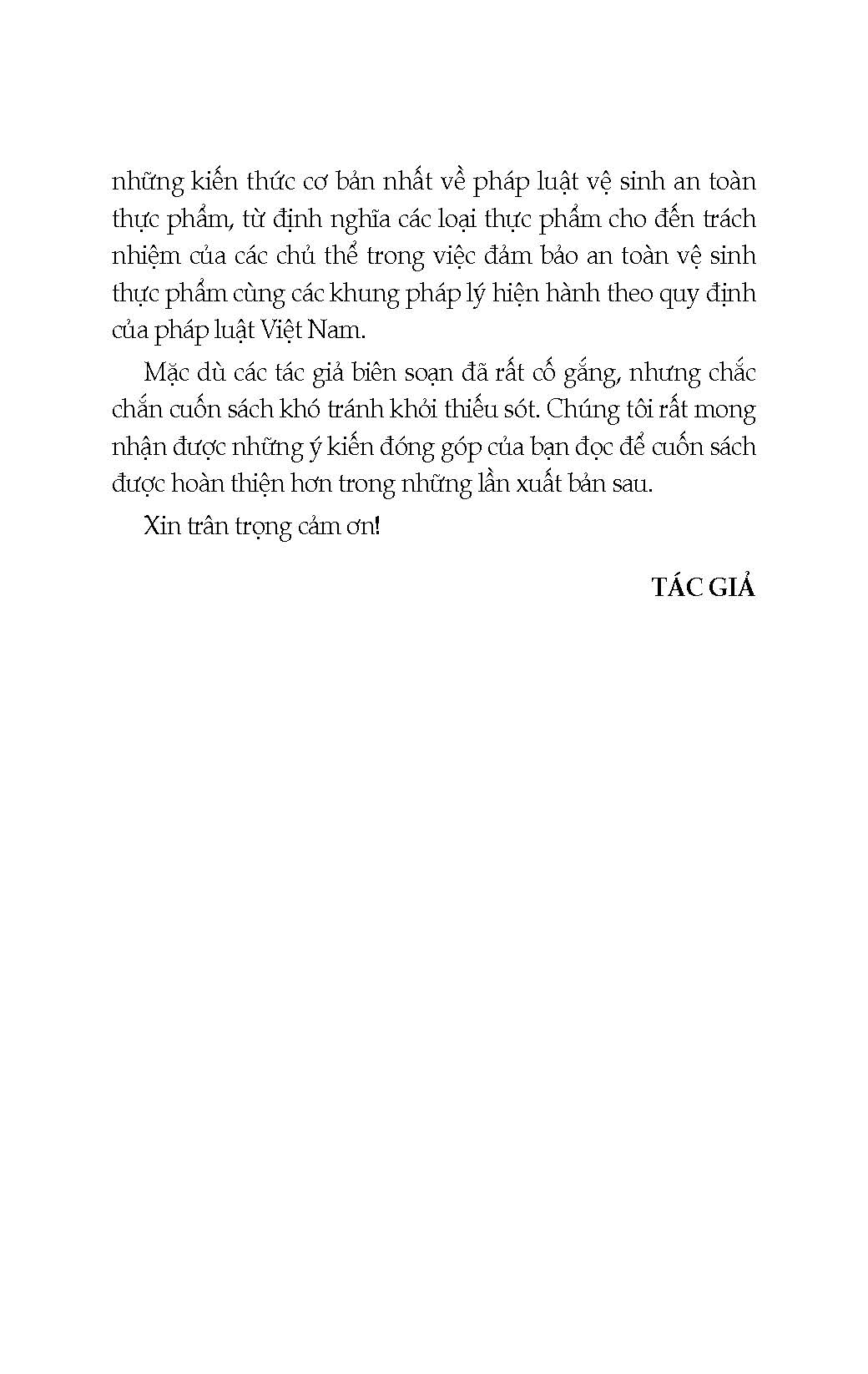 Thực phẩm là những sản phẩm ở dạng tươi sống hoặc đã qua sơ chế, chế biến, bảo quản mà con người ăn, uống hàng ngày. Việc sử dụng thực phẩm là một trong những nhu cầu sinh hoạt tối thiểu của con người… Để đảm bảo an toàn về sức khỏe cho người dân, các cơ quan quản lý nhà nước đã ban hành nhiều văn bản pháp quy, nhất là Luật An toàn vệ sinh thực phẩm, chính thức có hiệu lực và đi vào cuộc sống từ năm 2010. Vấn đề an toàn thực phẩm hiện nay đang được xã hội hết sức quan tâm bởi các vụ vi phạm trong lĩnh vực này có chiều hướng ngày càng gia tăng, gây thiệt hại tới sức khỏe, tính mạng và tài sản của nhân dân cũng như của toàn xã hội. Nguyên nhân thì có nhiều nhưng chủ yếu là ở hai khía cạnh. Trước hết là do hiểu biết về vệ sinh an toàn thực phẩm của xã hội nói chung còn nhiều hạn chế. Bên cạnh đó, do lợi nhuận trước mắt mà nhiều cá nhân và tổ chức bất chấp những quy định của pháp luật, cung cấp cho thị trường các sản phẩm thực phẩm không đảm bảo an toàn, gây nguy hại cho sức khỏe của người tiêu dùng. Do vậy, việc tuyên truyền, giáo dục và phổ biến pháp luật về vệ sinh an toàn thực phẩm là hết sức cần thiết nhằm nâng cao nhận thức và trách nhiệm của các cơ sở sản xuất, kinh doanh thực phẩm, hơn nữa là giúp người dân có thêm hiểu biết để trở thành những người tiêu dùng thông thái khi sử dụng thực phẩm. Cuốn sách Tư vấn, phổ biến và áp dụng pháp luật an toàn vệ sinh thực phẩm được biên soạn nhằm cung cấp cho độc giả những kiến thức cơ bản nhất về pháp luật vệ sinh an toàn thực phẩm, từ định nghĩa các loại thực phẩm cho đến trách nhiệm của các chủ thể trong việc đảm bảo an toàn vệ sinh thực phẩm cùng các khung pháp lý hiện hành theo quy định của pháp luật Việt Nam.