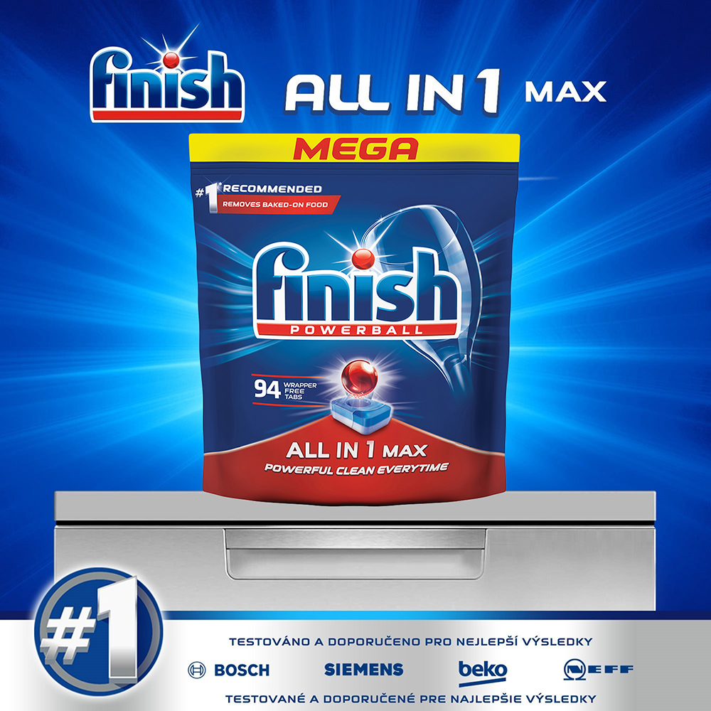 - Finish – thương hiệu rửa chén tự động được khuyên dùng bởi hầu hết các hãng máy rửa chén trên toàn thế giới. FINISH – EVERYDAY – EVERY LOVE Có thể bạn tin rằng mình đang sở hữu máy rửa chén tốt nhất với khả năng làm sạch một khối lương chén đĩa khổng lồ, nhưng bạn không nhận ra rằng công suất hoạt động của nó đang giảm dần theo thời gian. Việc sử dụng chất tẩy rửa kém chất lượng cũng là một nguyên nhân chính dẫn đến chu trình rửa của máy bị gián đoạn, không hiệu quả, gây mùi hôi và làm giảm tuổi thọ của máy rửa chén. Viên rửa chén Finish All In 1 Max Dishwasher Tablets là sự kết hợp của công thức enzyme đặc biệt tiên tiến với các thành phần độc đáo cùng nhiều tính năng ưu việt, có sức mạnh tẩy sạch chất dầu mỡ và thức ăn thừa bám trên chén đĩa kèm theo khả năng diệt khuẩn, làm bóng chén đĩa, các đồ sành sứ, thủy tinh, inox, dụng cụ nhà bếp, đặc biệt đánh bóng bề mặt thép không gỉ và đem lại hương thơm tươi mát dài lâu.