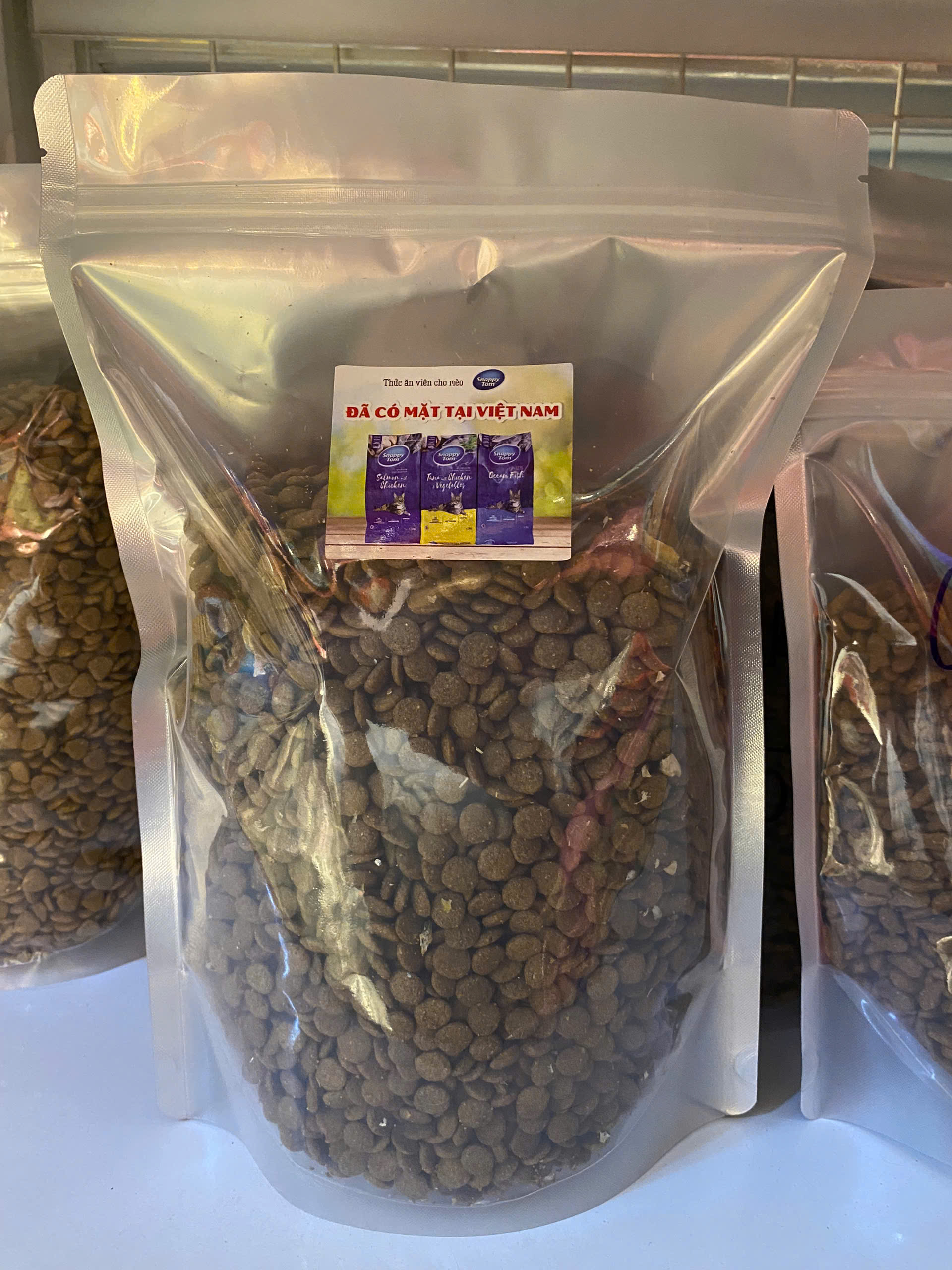 Hạt Snappy Tom cho Mèo có topping Thịt Cá Cơm thành phần từ Cá Hồi Thịt Gà Cá Biển và Rau củ