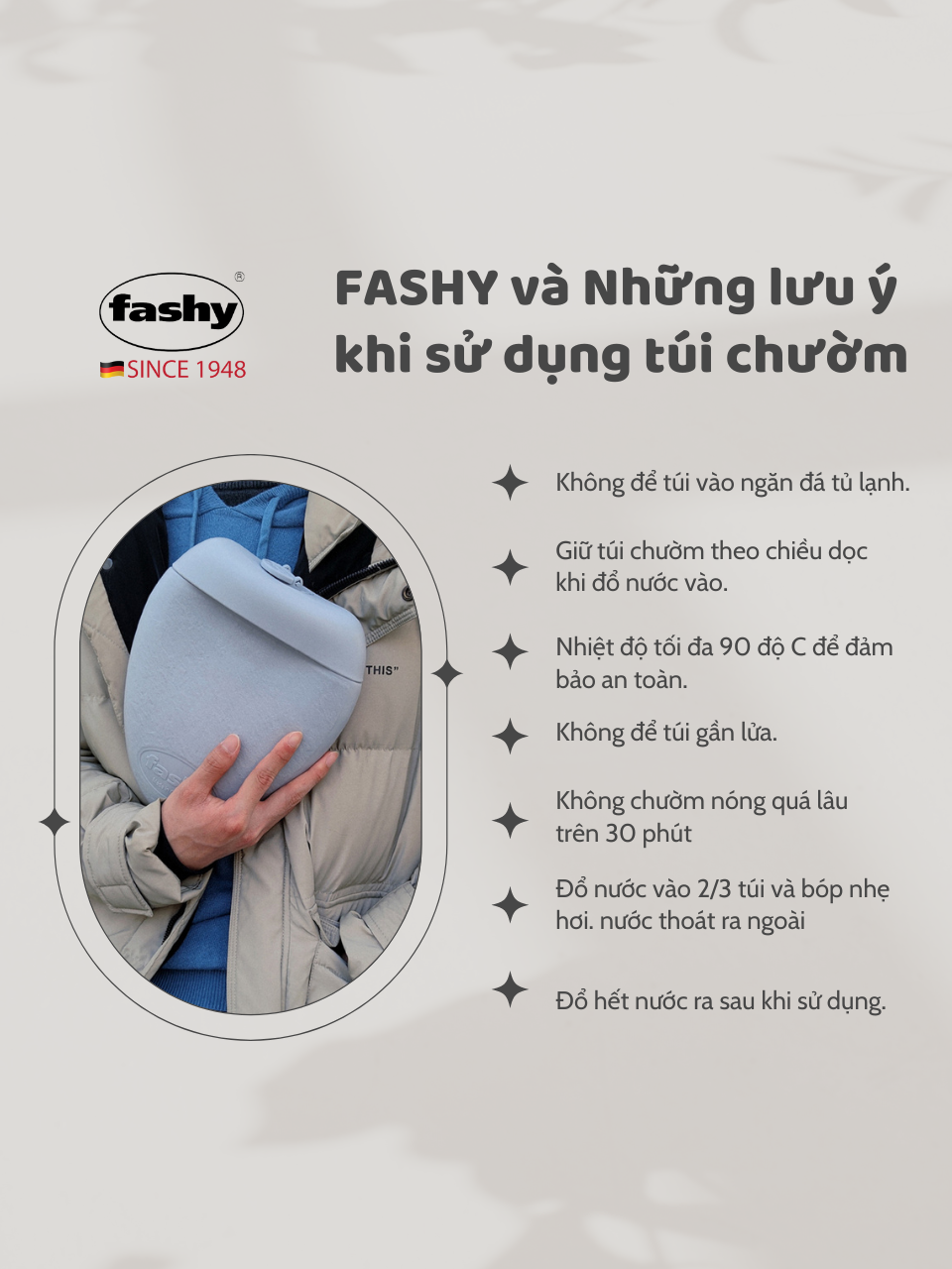- Túi chườm nóng thương hiệu Fashy – Đức được thiết kế với kiểu dáng thời trang, rất tiện dụng và an toàn khi sử dụng.