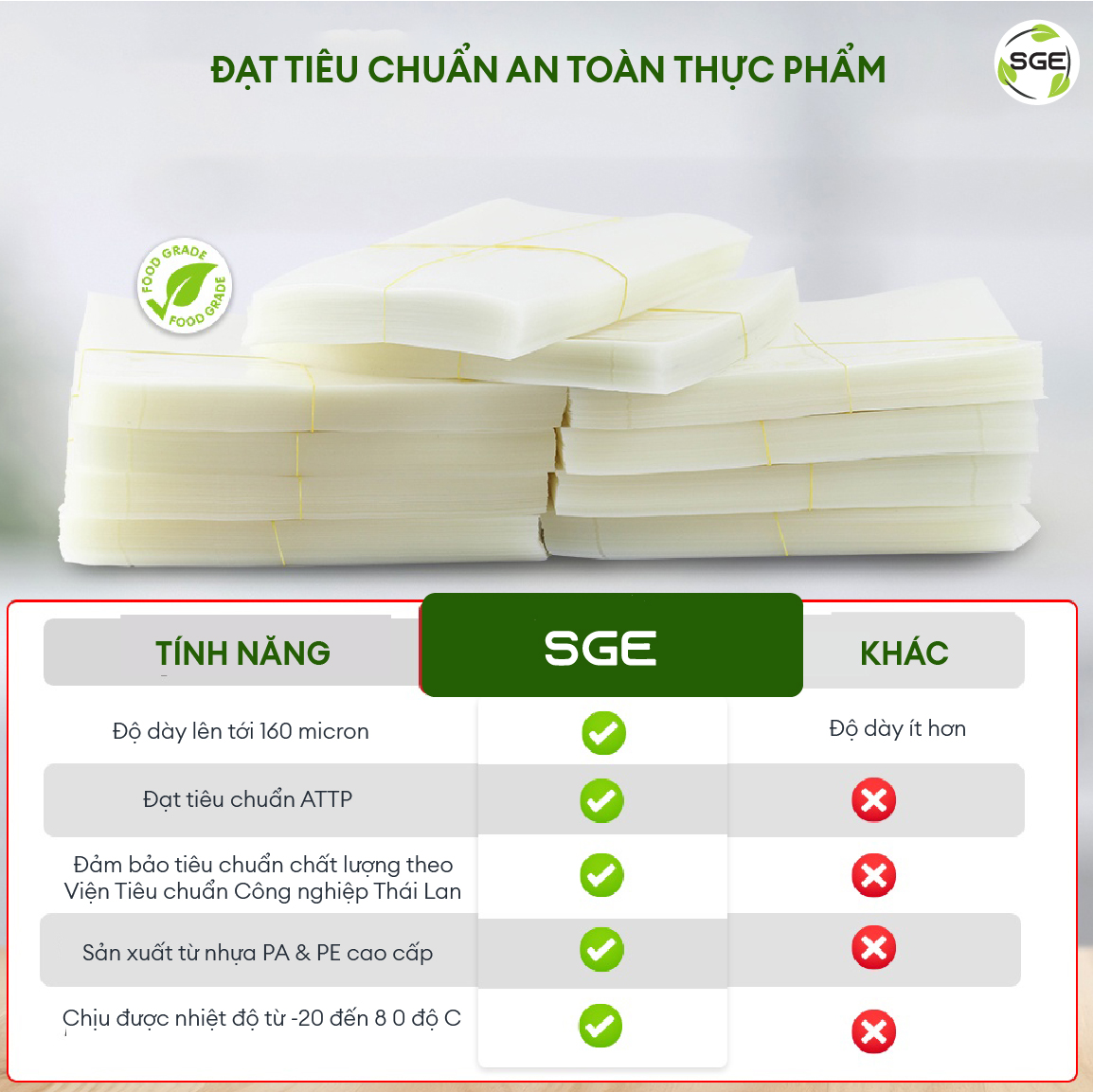 (Vacuum sealer bag) thương hiệu SGE của Thái Lan là sản phẩm sử dụng kèm với . Chất lượng tốt, dẻo dai, dày dặn, chịu được nóng và lạnh. Bảo vệ thực phẩm từng bước bằng lớp nhựa đạt tiêu chuẩn an toàn thực phẩm.