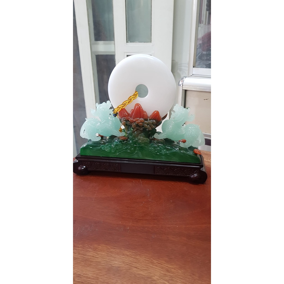 ✨Tượng Đồng Tiền ngọc bội Trắng Tài Lộc Đẹp Size Nhỏ Vừa Dài 28cm x Cao 24cm x Sâu 9cm có Hình Cặp Chim Cong Hoa Đào đẹp Tài Lộc bên Cặp Tỳ Hưu Xanh Ngọc nhẹ đẹp sang Hút Tài Lộc có Như Ý thỏi vàng đế gỗ hoa đẹp quá biểu tượng sự cao quý ạ