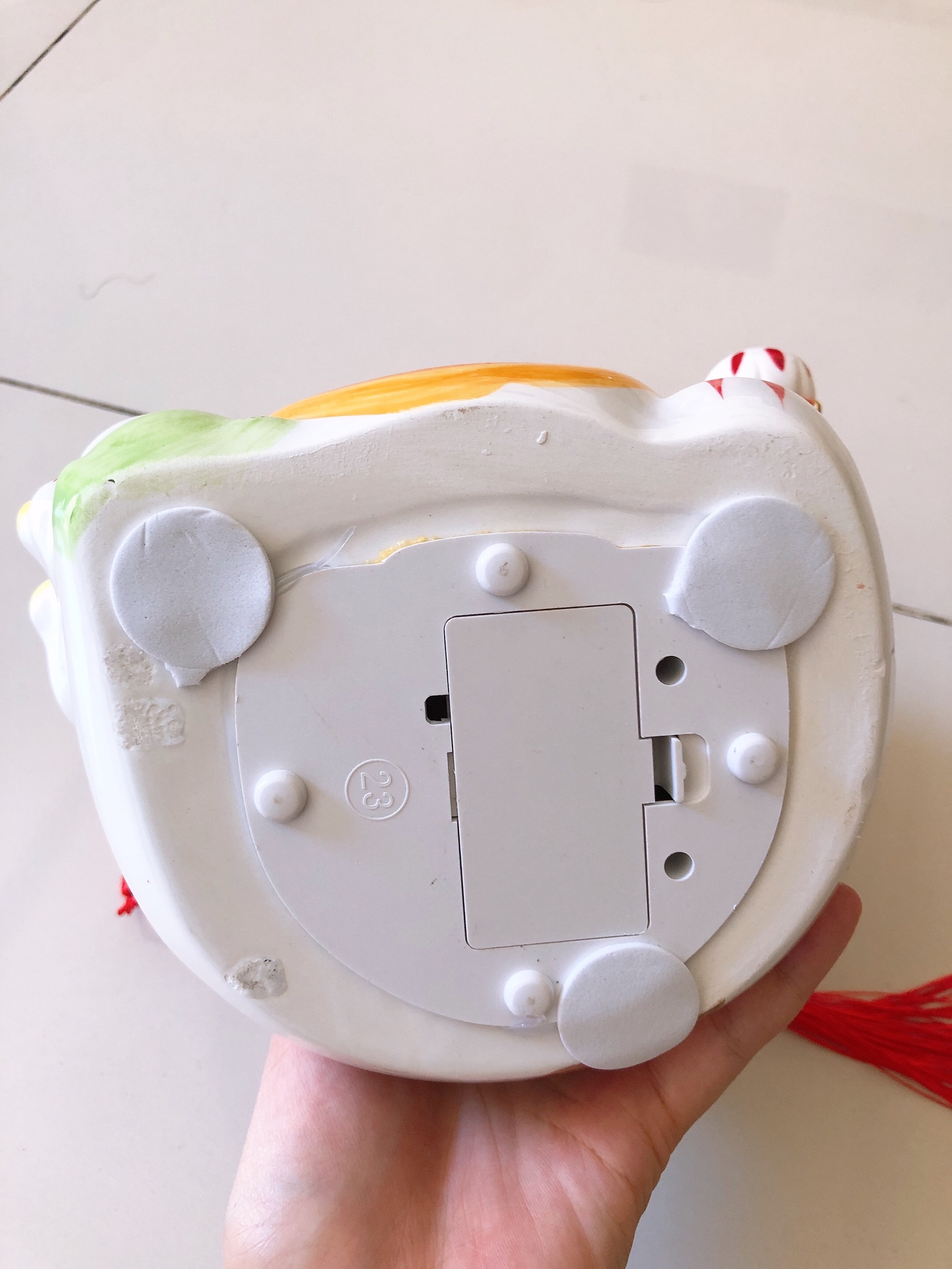 - Mèo thần tài được làm từ chất liệu gốm sứ cao cấp, để tránh bị đổ vỡ nên mèo được đặt trên tấm đệm bông in hoa đẹp mắt. Chú mèo có hình dáng
