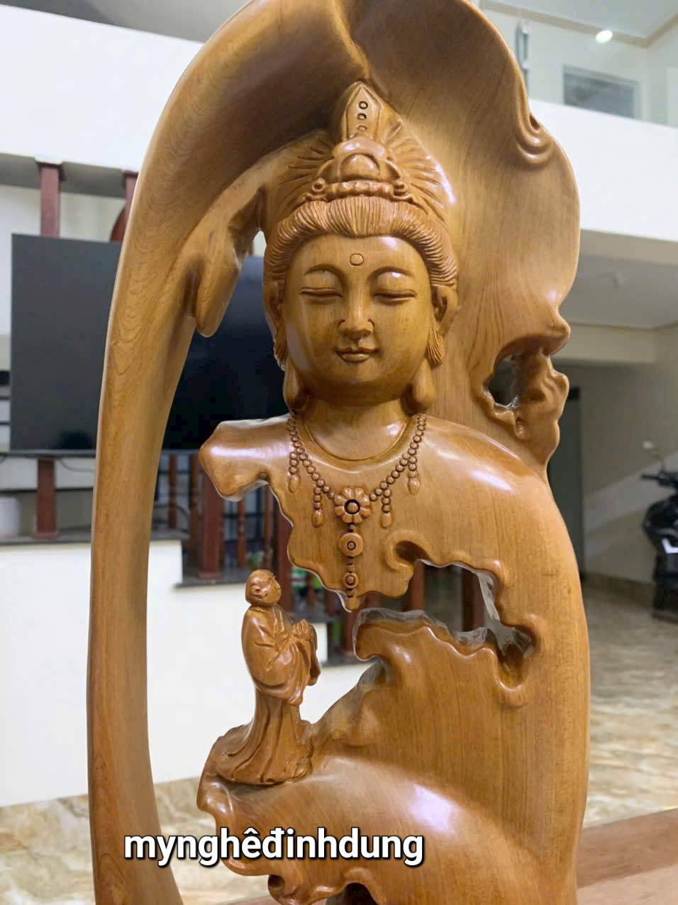 _ Tượng mẹ quan âm bồ tát được làm bằng chất liệu gỗ bách xanh liền khối tự nhiên 100% _ kt cao 15x9x9cm _ Tượng được chạm khắc gọt tỉa vô cùng tỉ mỉ