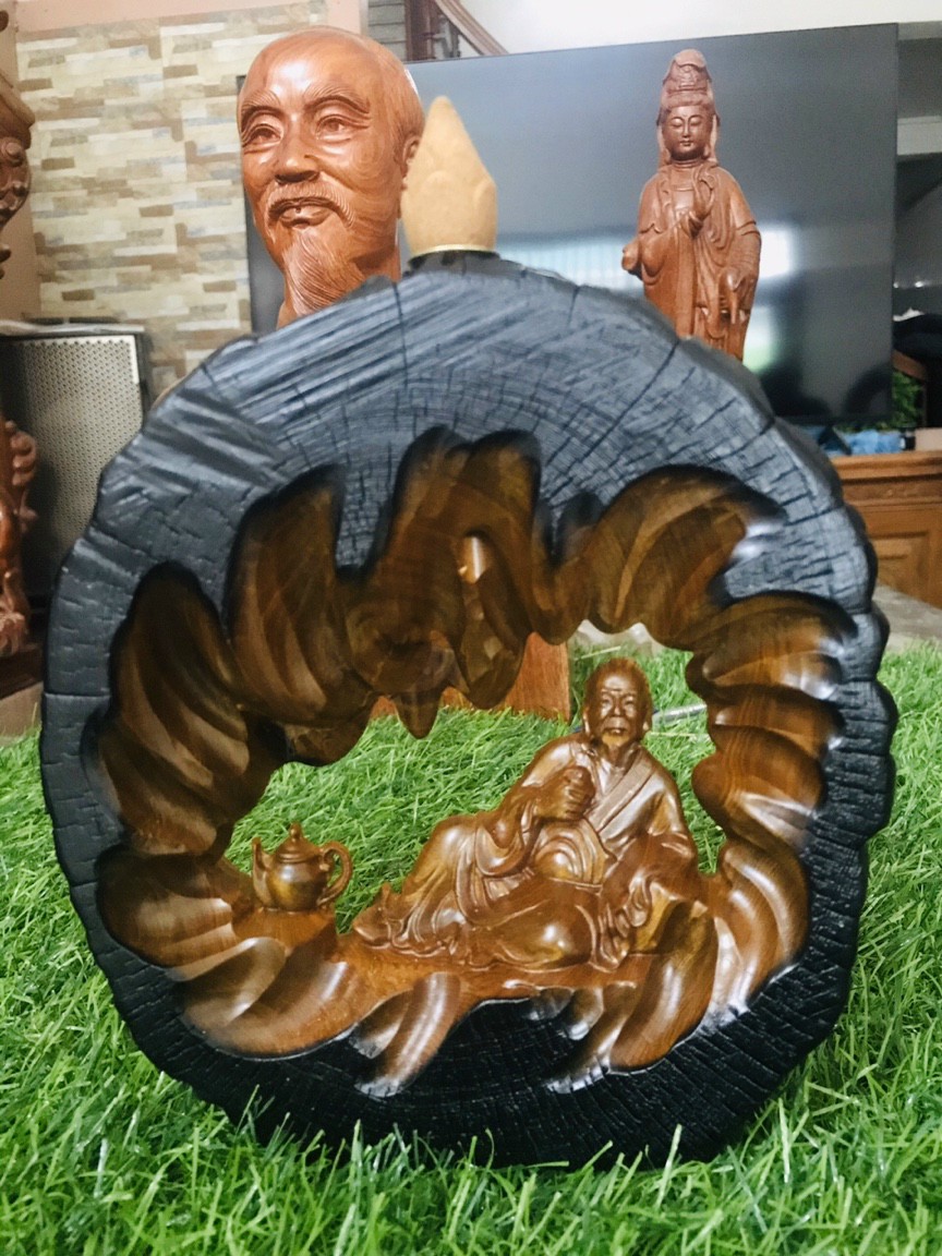Tác phẩm thần trà ngồi gỗ bách xanh