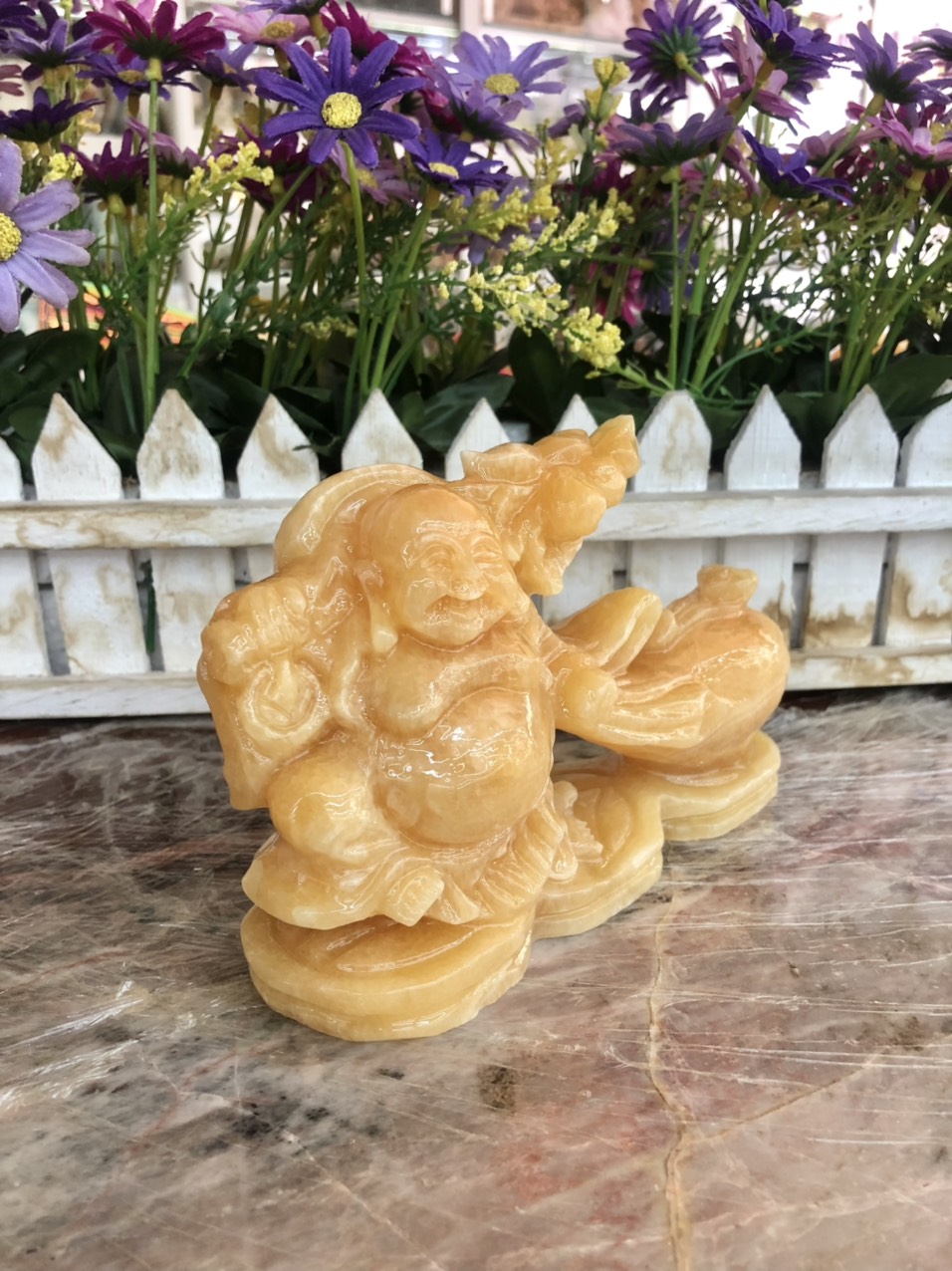 Chất liệu: Đá ngọc Hoàng Long Kích thước: Dài 50 cm x Rộng 20 cm x Cao 34 cm Khối lượng: 40 kg Phật Di Lặc trong Phong thủy Còn gọi là "Phật Cười", Di