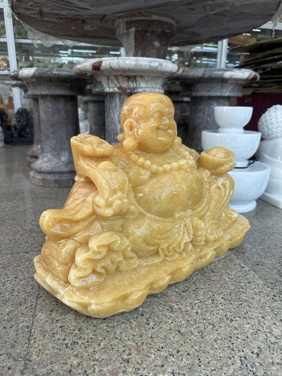 Chất liệu: Đá ngọc Hoàng Long Kích thước: Dài 50 cm x Rộng 20 cm x Cao 34 cm Khối lượng: 40 kg Phật Di Lặc trong Phong thủy Còn gọi là "Phật Cười", Di