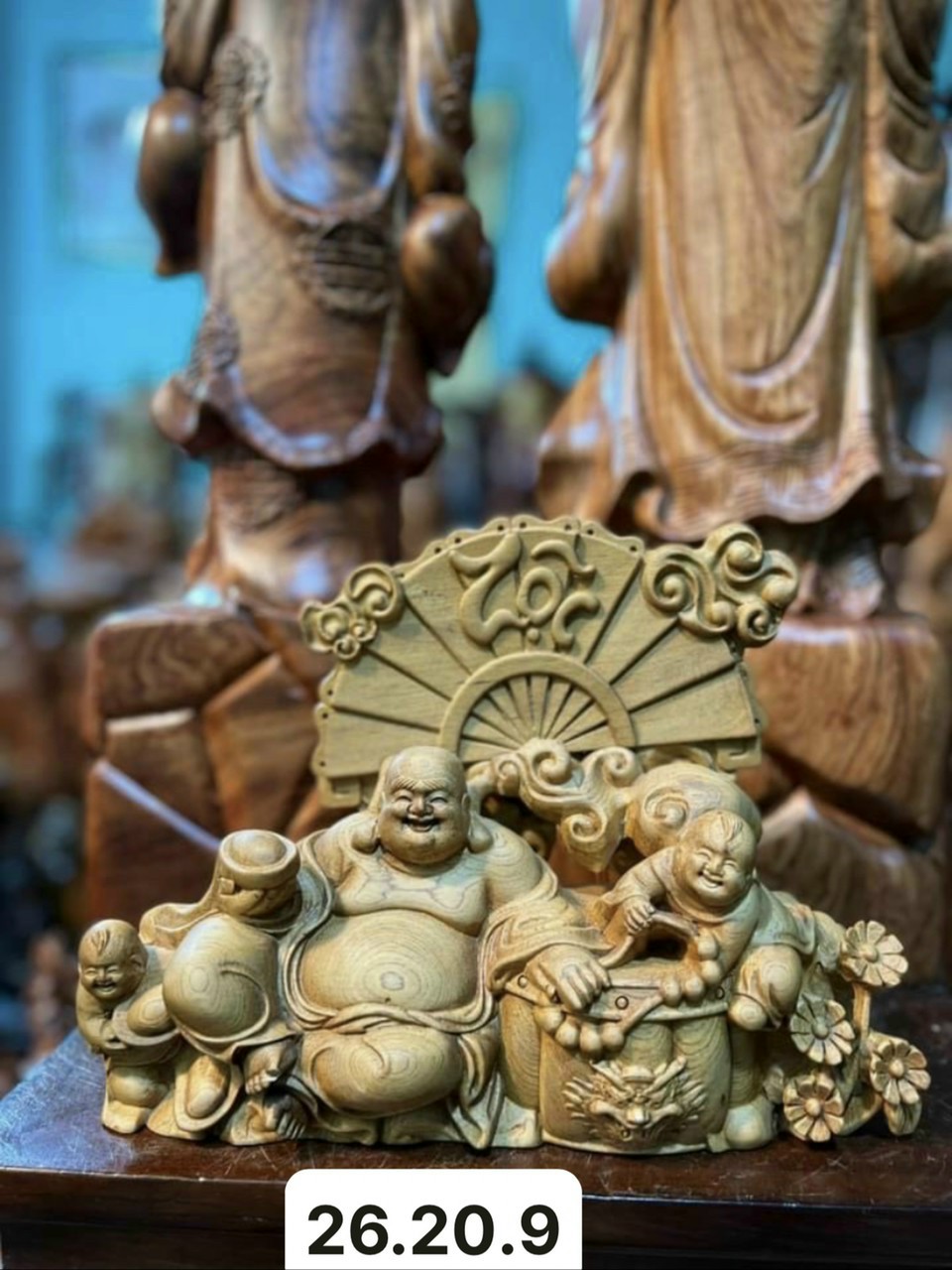 _ Tượng phật di lặc nhị phúc được làm bằng chất liệu gỗ bách xanh thơm nức tữ nhiên 100%