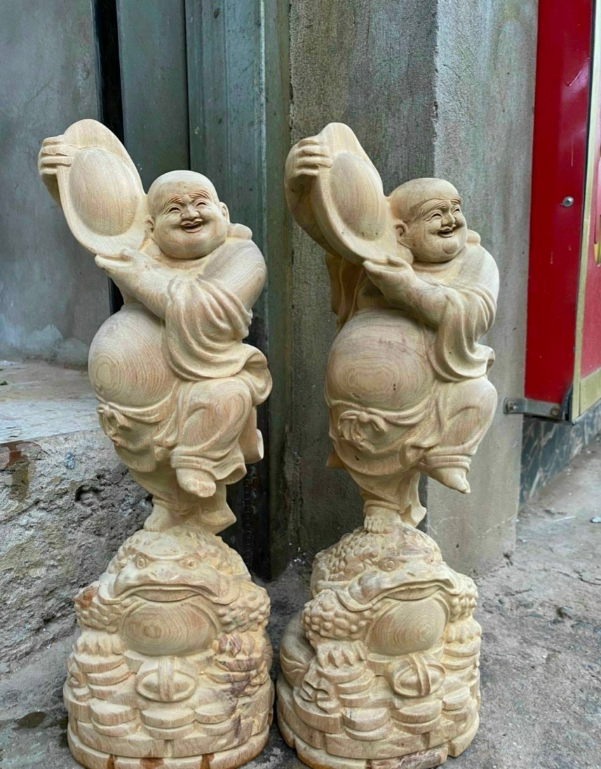 ✨Tượng phật di lặc tay ôm thỏi ,chân trấn cóc bằng gỗ bách xanh kt cao 40×15×16cm
