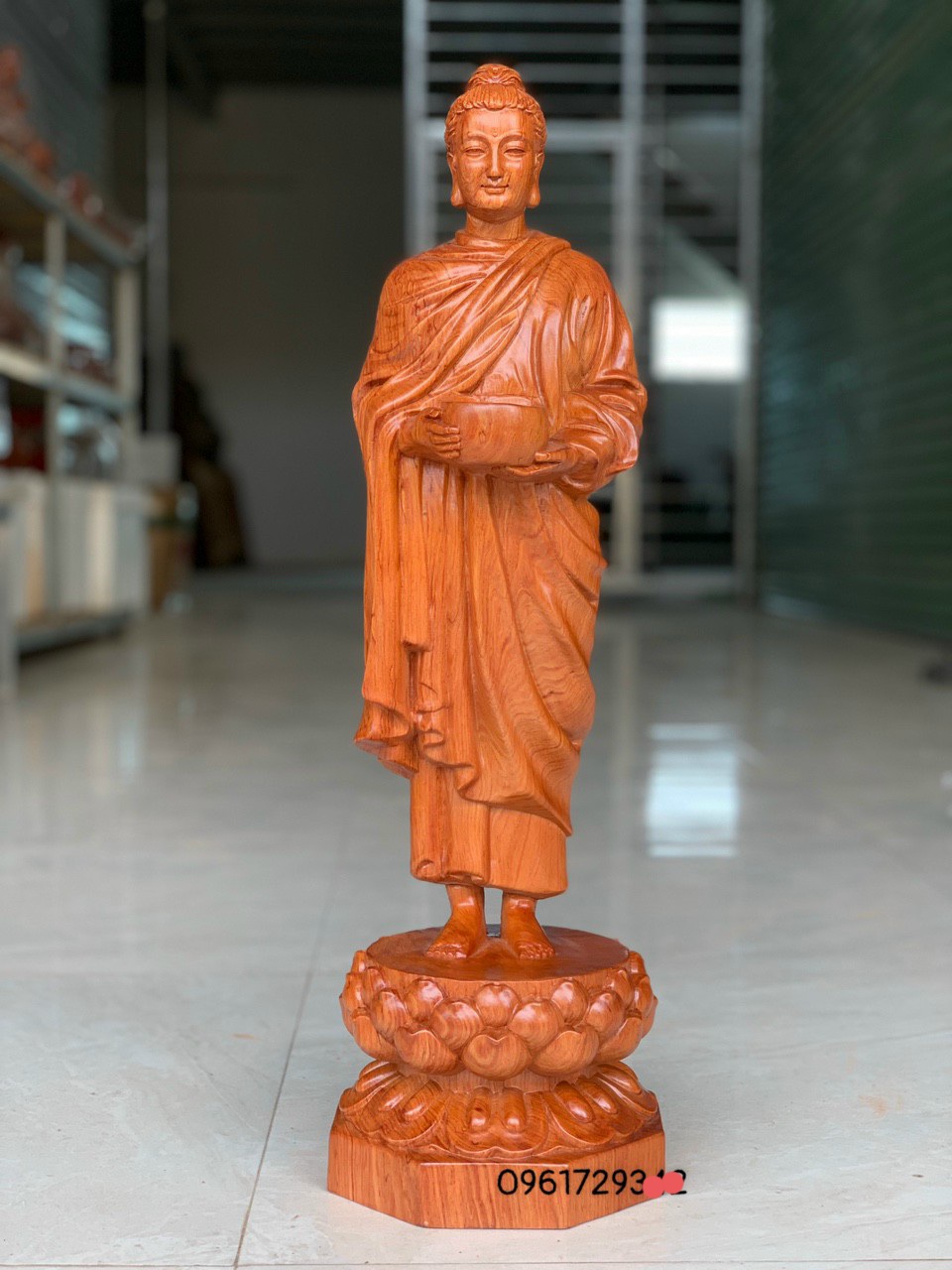 tượng phật thích ca khất thực đứng đài sen và trên cục đá