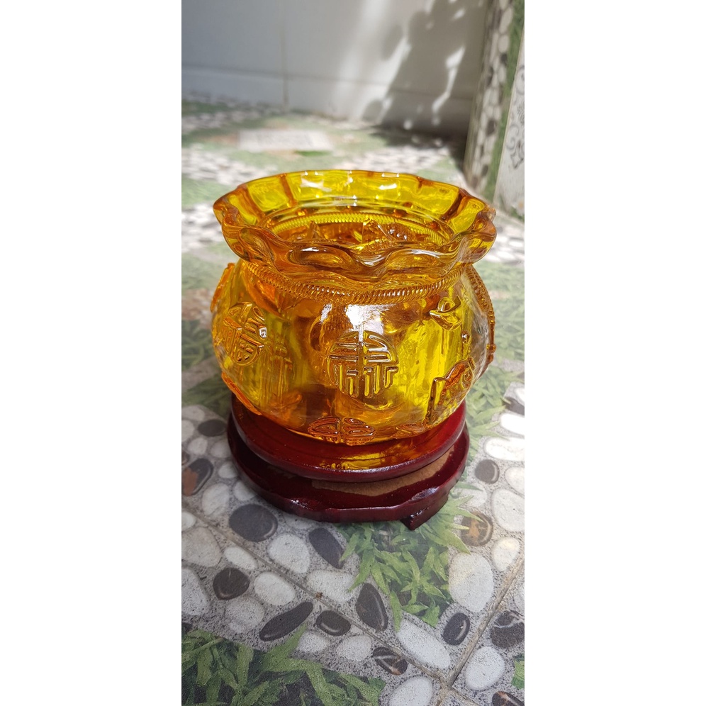 Thố tụ tài to mới miệng kiểu màu vàng anh tài lộc 20 thỏi xiền vàng đá lưu ly tự nhiên đế gỗ Size lớn đk 13cm x Cao 13cm cả đế x thố cao 9cm