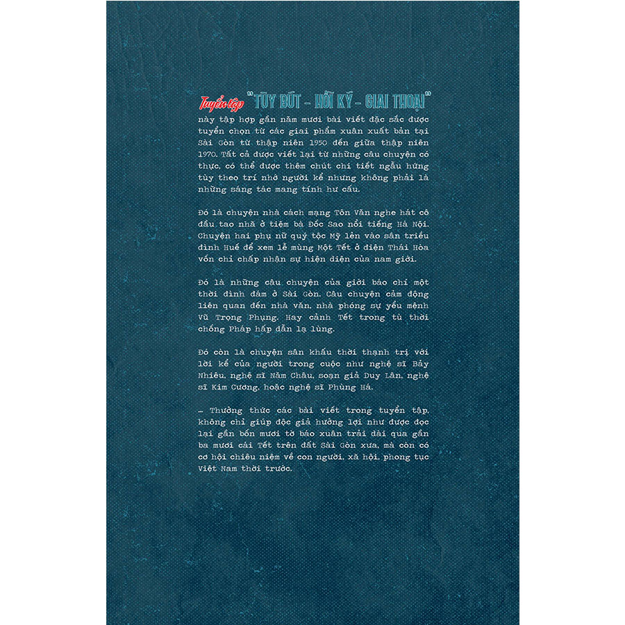 Tuyển tập Tùy Bút - Hồi Ký - Giai Thoại Trên Báo Xuân Sài Gòn Xưa tập hợp gần năm mươi bài viết đặc sắc được tuyển chọn từ các giai phẩm xuân xuất bản tại sài Gòn từ thập niên 1950 đến giữa thập niên 1970. Tất cả được viết lại từ những câu chuyện có thực, có thể được thêm chút chi tiết ngẫu hứng tùy theo trí nhớ người kể nhưng không phải là những sáng tác mang tính hư cấu.