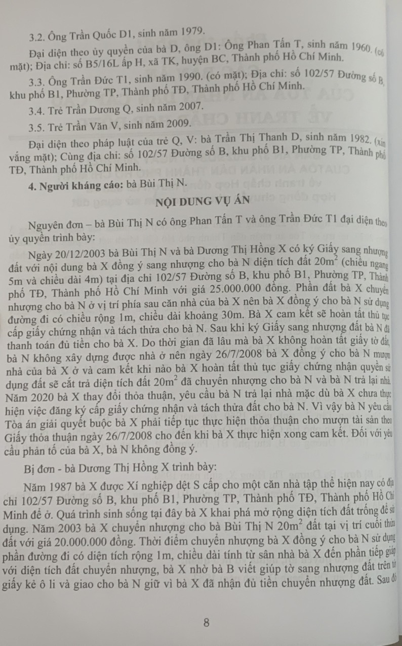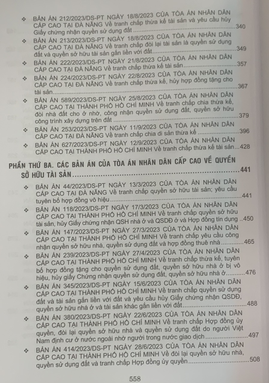 Phần thứ ba. Các Bản án của Tòa án nhân dân cấp cao về quyền sở hữu tài sản Hy vọng rằng đây sẽ là tài liệu hữu ích để bạn đọc, đặc biệt là Thẩm phán, Thẩm tra viên, Hội thẩm, Kiểm sát viên, Luật sư và các học viên tư pháp và những người làm công tác pháp luật nghiên cứu, áp dụng trong thực tiễn xét xử.