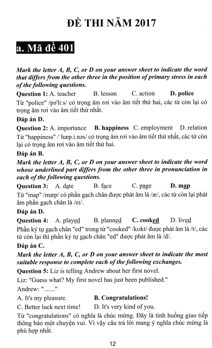 Bên cạnh đó, sách còn tổng hợp đề thi từ 2017 - 2022 có đáp án và lời giải chi tiết. Đây chính là cơ hội để sĩ tử làm bài thi thử đúng cấu trúc đề ra. Luyện đề nhiều còn tăng tốc độ làm bài, cải thiện điểm thi Tiếng Anh THPT Quốc Gia rõ rệt.