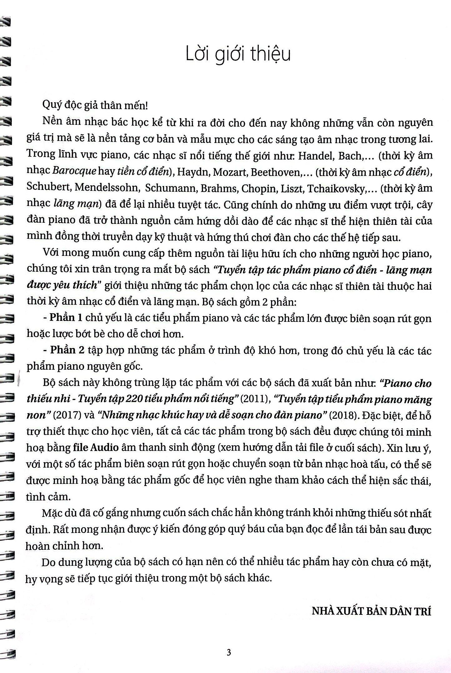 Bộ sách giới thiệu các tác phẩm piano được nhiều người yêu thích của những nhạc sĩ thiên tài thuộc hai thời kỳ âm nhạc cổ điển và lãng mạn, hoàn toàn không trùng lặp với các ấn phẩm đã phát hành như: “Piano cho thiếu nhi – Tuyển tập 220 tiểu phẩm nổi tiếng” (2011), “Tuyển tập tiểu phẩm piano măng non” (2017) và “Những nhạc khúc hay và dễ soạn cho đàn piano” (2018). Đặc biệt, để hỗ trợ thiết thực cho học viên, tất cả các tác phẩm trong bộ sách đều được minh họa qua file Audio âm thanh sinh động. Ngoài ra, chất lượng in cao cấp, thiết kế thoáng đẹp với gáy xoắn, thuận tiện khi đặt trên giá nhạc để thị tấu cũng là những ưu điểm của bộ sách này.