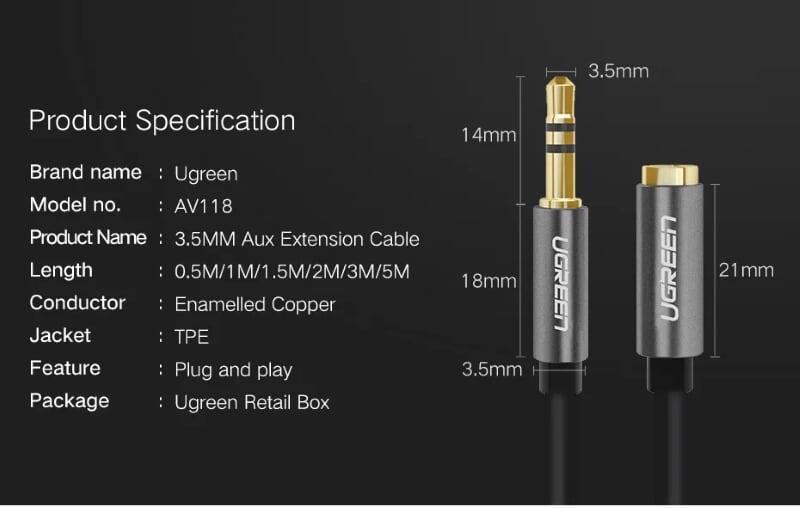 Ugreen 10737 3.5Mm Male To 3.5Mm Male Cable 5M AV119 1. Features: Cables for connecting phones, laptops, tablets with handsets. 2. Cable length: 5M 3. Color: Black 4. Jack: 2 * Audio 3.5mm Male. 5.