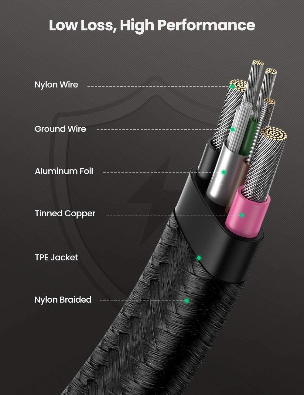 1. Connector A: 1 x 3.5mm Jack Male 2. Connector B: 2 x RCA Female, White (Audio left) Red (Audio right) 3. Cable Material: Nylon Braided 4. UGREEN 3.5mm(1/8" headphone plug) to 2 RCA(Right/Left) stereo