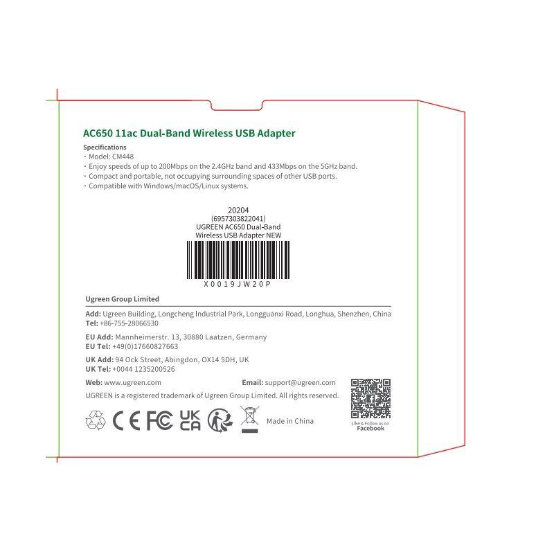 UGREEN AC650 11ac Dual-Band Wireless WiFi USB Adapter CM448 20204
