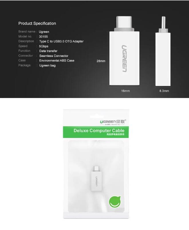 Ugreen 30155 usb 3.1 type c superspeed male to usb 3.0 type a female adapter trắng us173 1. Features: Convert USB-C to USB 3.0 - use data transfer. 2. Color: White 3. Material: ABS 4.