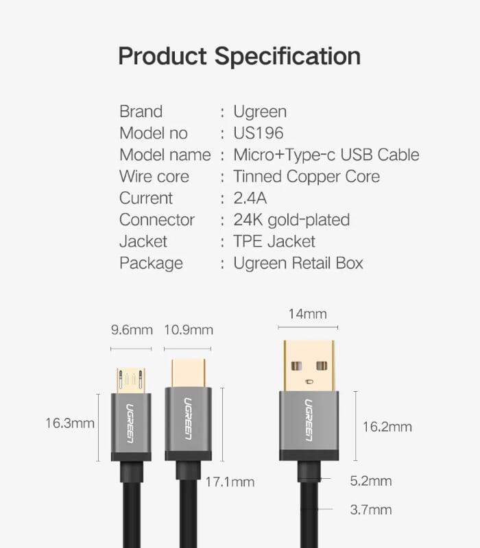 Ugreen 40418 Usb 2.0 To Micro Usb + Type C Data Cable White 1.5M Us142 1. Features: connect Laptop, Tablet USB-C port to digital camera, DSLR, music player, GPS Mini USB port 2. Cable length: