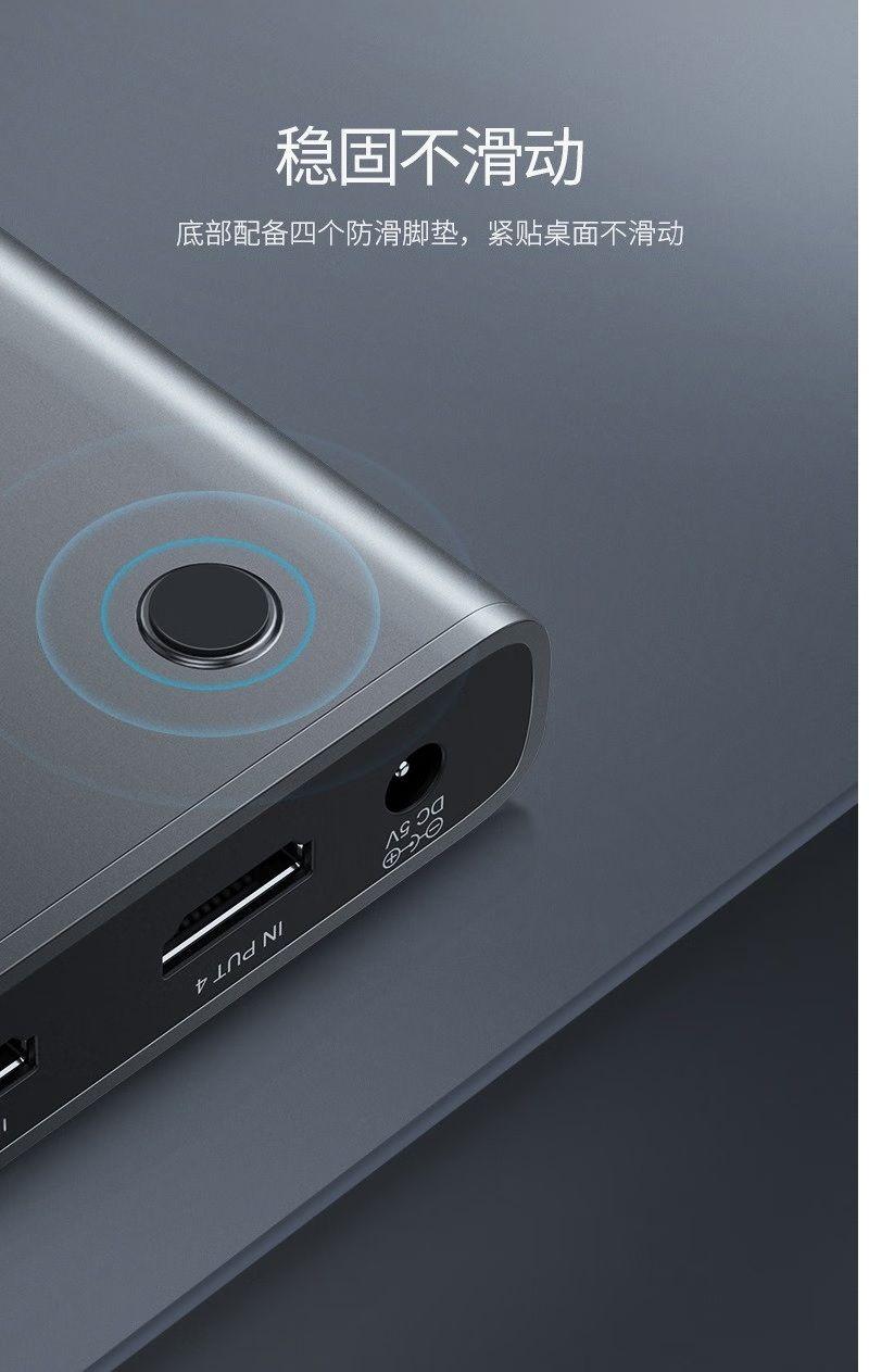 1. Input: HDMI*2, USB 2.0 Type-B*2, Mini USB*1 2. Output: HDMI*1, USB 2.0 Type A*4 3. HDMI Version: 2.0 (backward compatible) 4. Maximum resolution: 4K*2K/60Hz (2K and 1080P compatible) 5. Supported operating systems: Windows; Mac