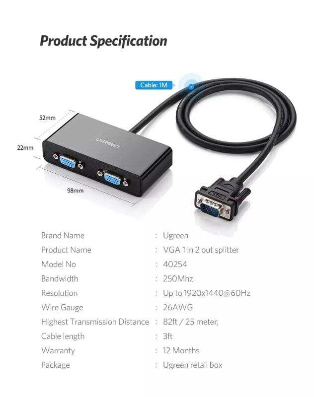Ugreen 40254 Cáp chia VGA 1 ra 2 dài 1m VGA Male to 2 Female Video Splitter Cable VGA 1*2 Splitter 40254 1. Length : 1M 2. Color : Black 3. VGA Male to 2