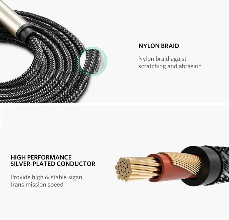 1.Connector type: Auxiliary 2.Cable type: Aux 2.Cable material: Nylon braided jacket, 4k gold-plated plugs, sturdy brass shells 3.Compatible devices: Laptop, Car aux stereo, Hedaphone, PlayStation, Personal Computer, MP3 MP4 players, Tablet, Xbox, Smartphone, Speaker 4.Color: