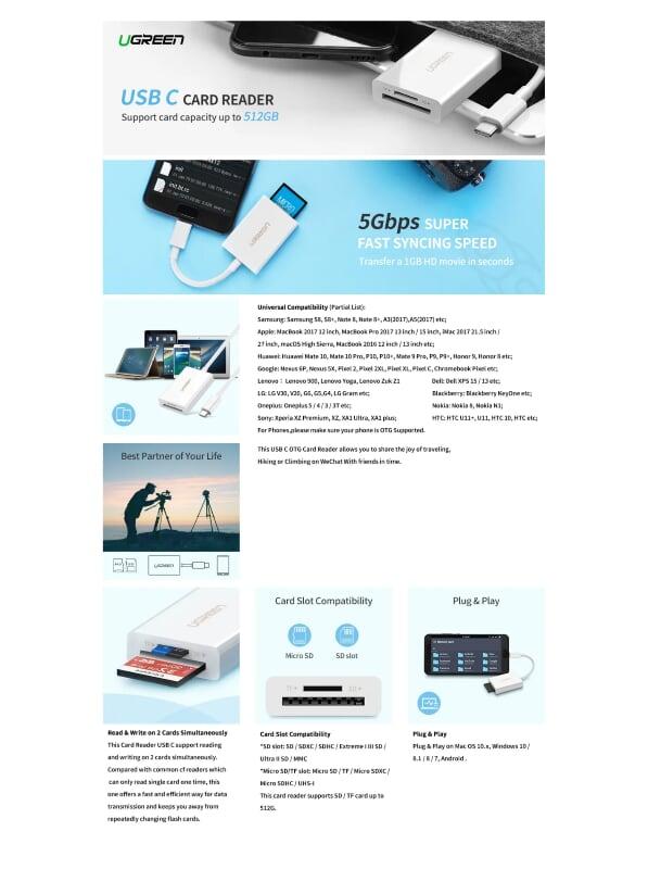 Ugreen 40864 type c to sd tf card reader 4.0 trắng us235 1. Competence: your features, features, talents and talents. 2. Cable length: 73mm 3. Color: 4. Material: ABS 5. USB Type-C connector with OTG