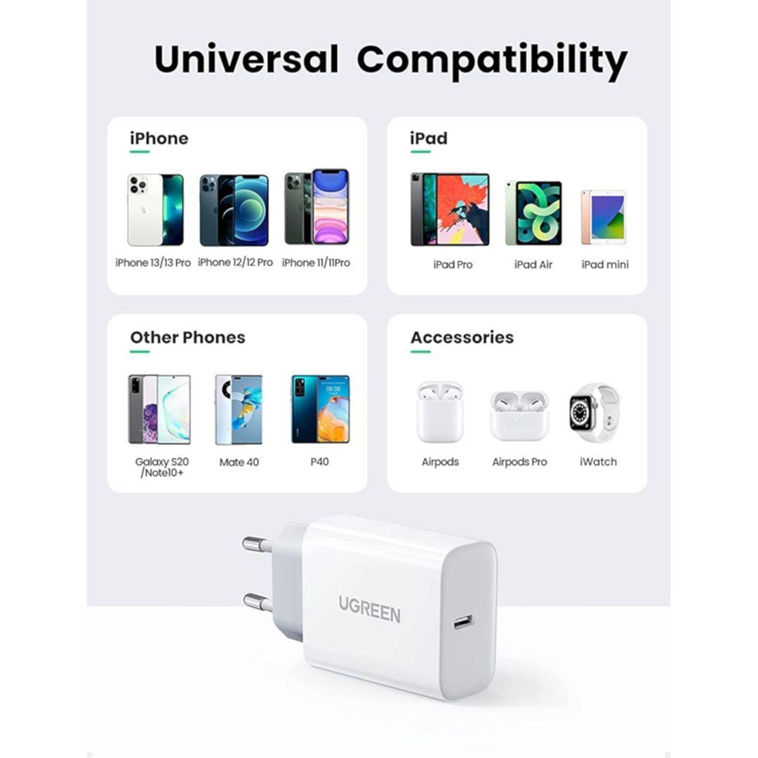 ✨Ugreen UG50698CD137TK 1M PD 20W USB-C 3.0 Màu Trắng Bộ sạc + cáp sạc nhanh Lightning dành cho iPhone 13 12 Pro Max 11 Pro SE 2022 X XS XR 8 Plus - HÀNG CHÍNH HÃNG