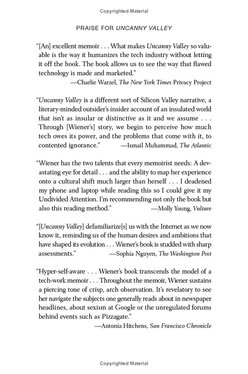 Uncanny Valley ‘Joan Didion at a startup’ Rebecca Solnit ‘Impossibly pleasurable’ Jia Tolentino ‘This is essential reading’ Stylist At twenty-five years old, Anna Wiener was beginning to tire of her assistant job in New York publishing.