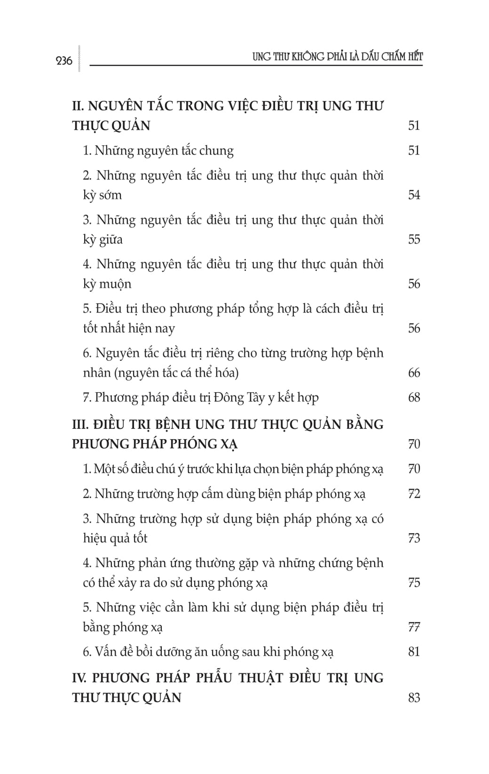 Mua tại TiktokBộ sách Ung thư không phải là dấu chấm hết gồm 5 quyển. Mỗi quyển là một sự tìm hiểu mỗi chứng bệnh ung thư khác nhau: Gan, Phổi, Thực quản, Đại tràng, tuyến vú; cung cấp những kiến thức cơ bản cần thiết nhằm giúp chúng ta chủ động phòng chống và chiến thắng bệnh tật. Ung thư thực quản giúp chúng ta tìm hiểu nguyên nhân dẫn tới bệnh, nguyên tắc và phương pháp điều trị bệnh ung thư thực quản như: phương pháp phẫu thuật điều trị, phương pháp hóa chất, điều trị bằng thuốc Đông y, phương cách điều dưỡng bệnh nhân bằng thức ăn, một số việc nên làm để phòng bệnh,…