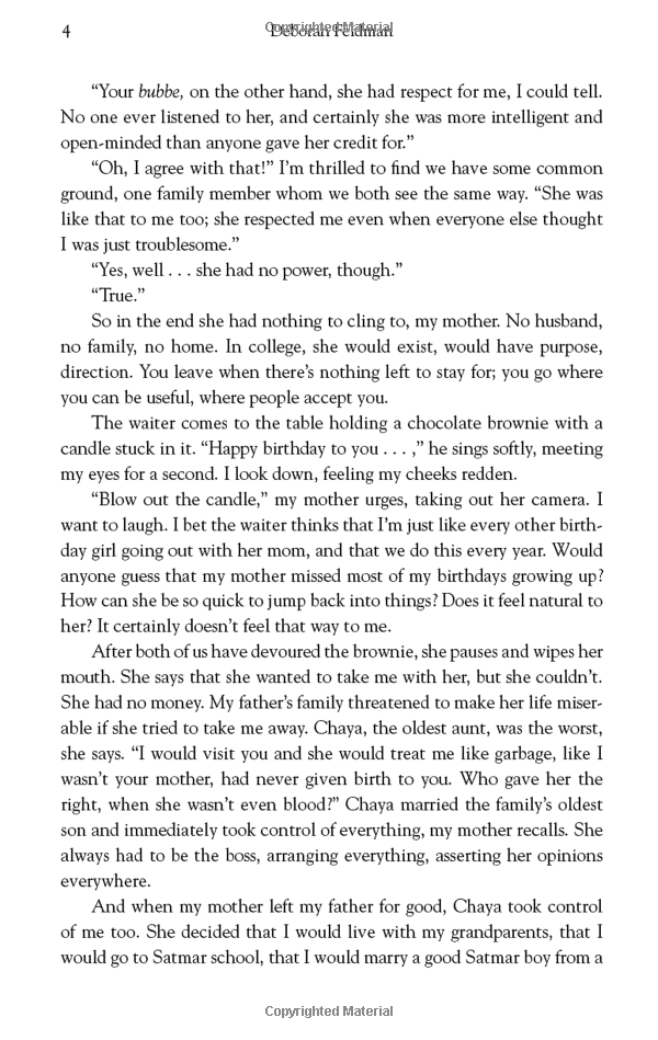 As a member of the strictly religious Satmar sect of Hasidic Judaism, Deborah Feldman grew up under a code of relentlessly enforced customs governing everything from what she could wear and to whom she could speak to what she was allowed to read. Yet in spite of her repressive upbringing, Deborah grew into an independent-minded young woman whose stolen moments reading about the empowered literary characters of Jane Austen and Louisa May Alcott helped her to imagine an alternative way of life among the skyscrapers of Manhattan. Trapped as a teenager in a sexually and emotionally dysfunctional marriage to a man she barely knew, the tension between Deborah’s desires and her responsibilities as a good Satmar girl grew more explosive until she gave birth at nineteen and realized that, regardless of the obstacles, she would have to forge a path—for herself and her son—to happiness and freedom.