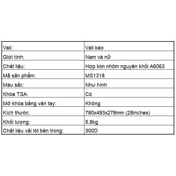 ✨Vali hợp kim nhôm nguyên khối MS1318 Macsim cao cấp màu đen , màu bạc,màu ti-gold cỡ 28inches