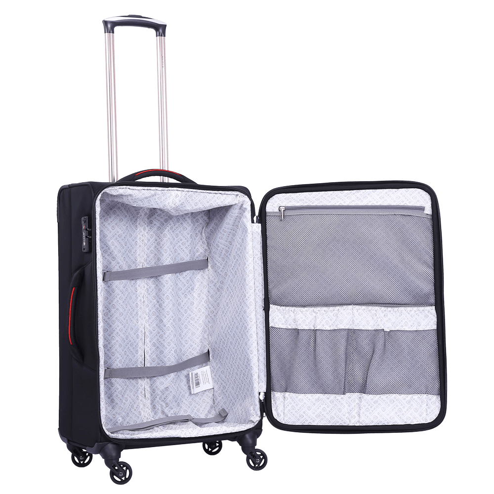 Vali Kéo Du Lịch đen Phối đỏ Có Nắp - 22 Inch được thiết kế từ chất liệu vải Polyester có độ bền cao, chống thấm nước tối ưu giúp bảo vệ hành lý bên