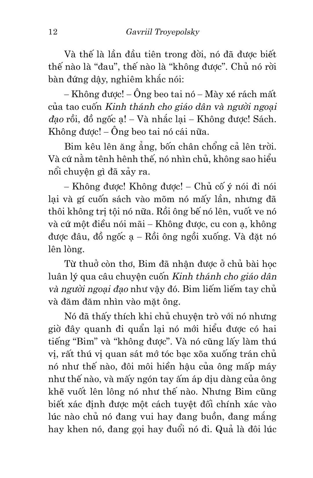 Khi phải lên thành phố chữa bệnh, người thợ săn Ivan Ivanych đã gửi Bim, chú chó thân yêu của m.ình, cho hàng xóm trông coi. Nhớ chủ đến nối bỏ cả ăn, Bim quyết định ra đi tìm người mà suốt bốn năm chung sống nó chưa bao giờ phải rời xa ấy. Lang thang hết nơi này đến nơi khác giữa mùa đông lạnh giá, Bim trải qua không biết bao nhiêu nỗi vất vả và gian nguy. Bị bắt, bị nhốt và hành hạ đến nỗi chân thì giập nát còn cơ thể ngày càng tàn tạ, suy kiệt song Bim vẫn không thay đổi quyết tâm. Nhưng đến khi người chủ thân yêu gặp được Bim, thì nó đã ra đi mãi mãi. Băng tuyết rơi trên cánh mũi Bim không thể tan ra bởi hơi ấm cơ thể đã không còn.