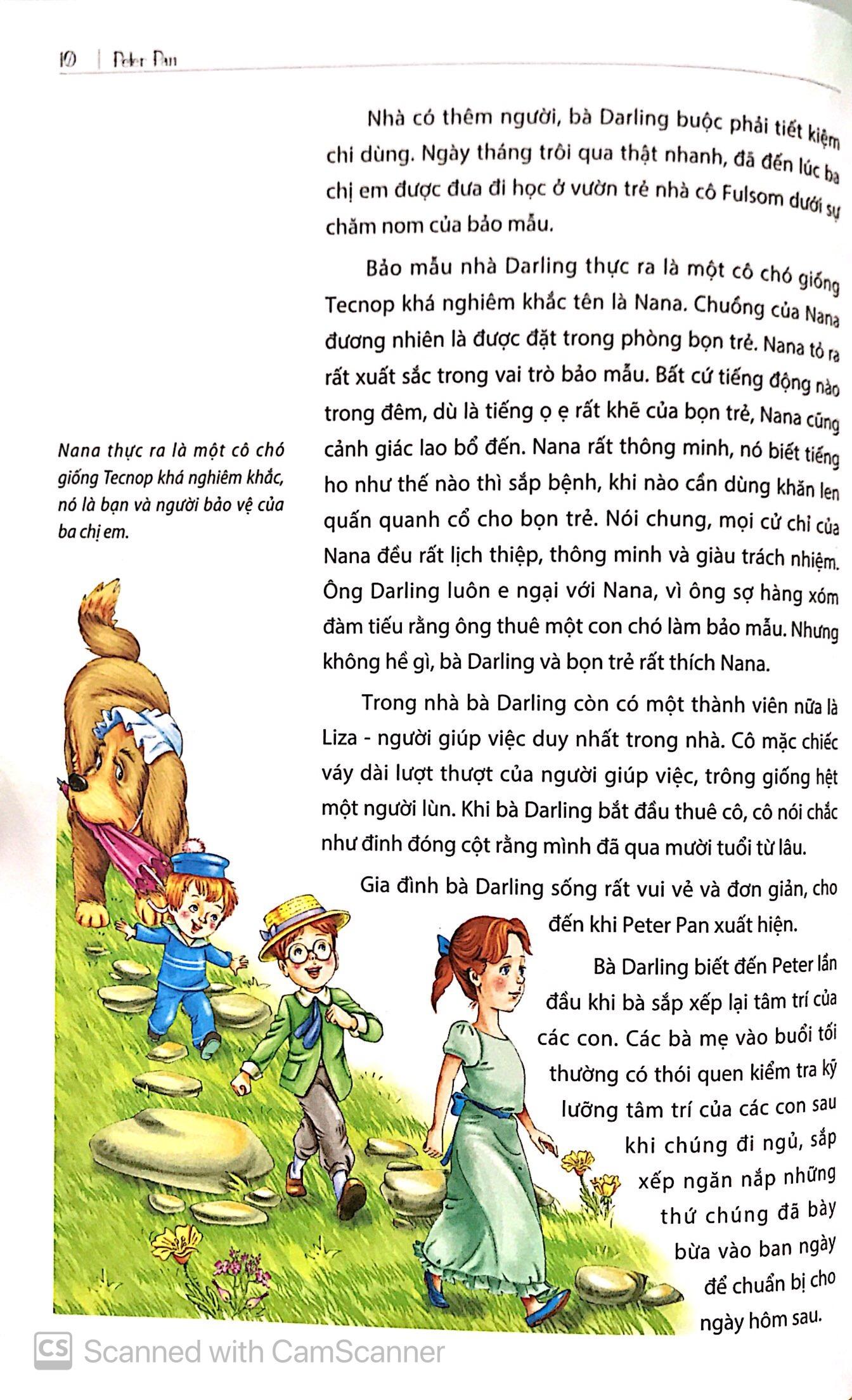 Mua tại TiktokPeter Pan được biết đến là đứa trẻ không bao giờ lớn. Anh chàng dạy 3 đứa trẻ là Wendy, John và Micheal học bay. Nhân lúc bố mẹ không có nhà, chúng đã bay đến xứ sở Neverland bí ẩn. Trên đảo có các nàng tiên nhỏ, đám cướp biển và các nàng tiên cá mà các em nhỏ đã quen thuộc trong truyện cổ tích. Trong câu chuyện, Peter và các bạn nhỏ được cùng nhau vui chơi và trải qua những chuyến du lịch mạo hiểm nhưng không kém phần thú vị. Thông qua hình tượng nhân vật Peter Pan, độc giả sẽ nhận ra rằng: tuổi thơ ấu là một áng văn chương tươi đẹp nhất, mơ mộng nhất trong một cuốn sách lớn của đời người. Mỗi bạn nhỏ, hãy tự viết cho mình một cuốn sách cuộc đời và tận hưởng những niềm vui thuộc về bản thân.