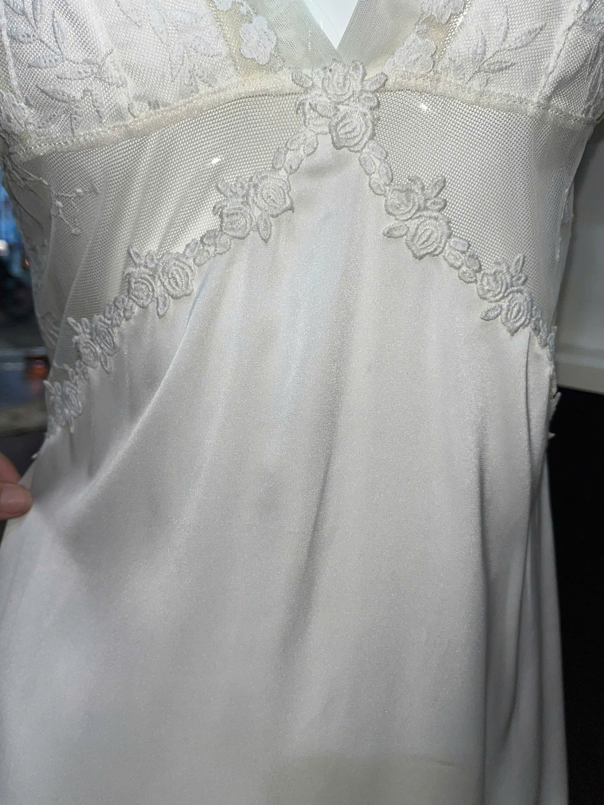 Thương hiệu: Sanny House Tên sản phẩm: Váy ngủ Chất liệu: lụa cao cấp mềm mịn, co giãn, thấm hút tốt Kiểu dáng: gợi cảm, trẻ trung, hiện đại Màu: trắng Size: dưới 56kg