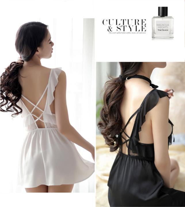 Váy ngủ có phần lưng eo là dây đan chéo thu hút, bờ lưng trần vốn quyến rũ sẽ càng thêm quyến rũ.