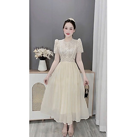 Mua tại TiktokD4980] Váy thiết kế ren cúc bọc tay bồng pha chân tơ dáng dài Shop về 2 size S.M 2 màu trắng và kem