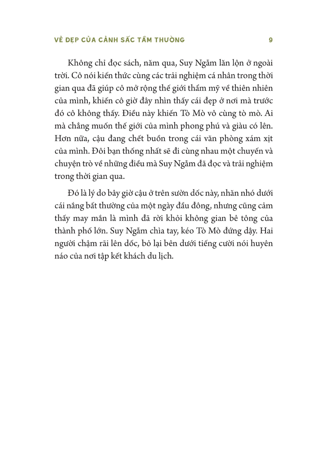 Cuốn sách “Vẻ đẹp của cảnh sắc tầm thường” mở ra những con đường mới để mỗi người có thể phát triển khả năng rung động và kết nối sâu sắc với mọi hình thái của thiên nhiên, thay vì chỉ với những phong cảnh hợp I.n.s.ta.g.ra.m. Hành trình của Tò Mò và Suy Ngẫm cũng giúp ta đi xuyên qua vẻ bề ngoài để cảm nhận được vẻ đẹp của sự phong phú, phức tạp và bí ẩn của âm thanh và mùi vị; của chuồn chuồn, nhện và bướm di cư; của đầm lầy, hoa tàn và lúc xấu trời - những điều mà trước kia ta coi là bình thường, thậm chí tầm thường, xấu xí.