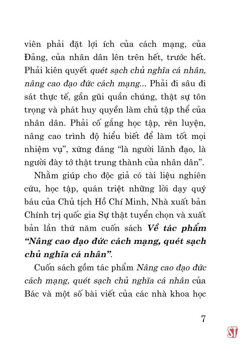 Cuốn sách gồm tác phẩm Nâng cao đạo đức cách mạng, quét sạch chủ nghĩa cá nhân của Chủ tịch Hồ Chí Minh và một số bài viết của các nhà khoa học nghiên cứu về tác phẩm quan trọng này, đã được công bố nhân dịp kỷ niệm 40 năm tác phẩm ra đời.