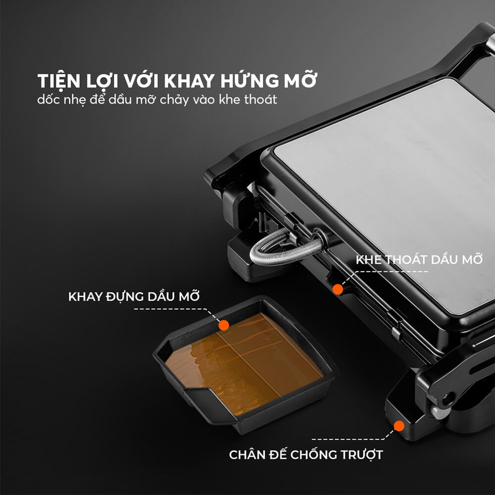 ĐẶC ĐIỂM NỔI BẬT - Cấu tạo bếp nướng thông minh, dễ dàng tháo lắp vệ sinh sau khi sử dụng - Bề mặt phủ chống dính đá hoa cương Whitford – USA siêu bền,